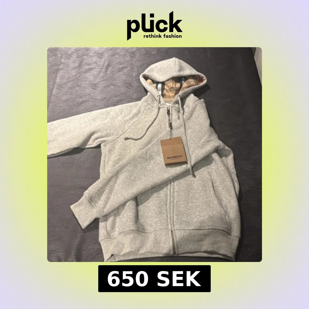 Säljer en grå hoodie från Burberry med klassiskt rutigt foder i huvan. Tröjan har snörning i huvan, dragkedja framtill och två fickor. Perfekt för dig som vill ha en stilren och lyxig look med ikoniska Burberry-detaljer. Storlek M men passar mer som S