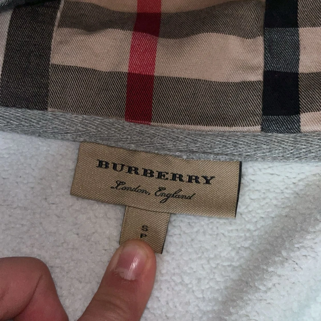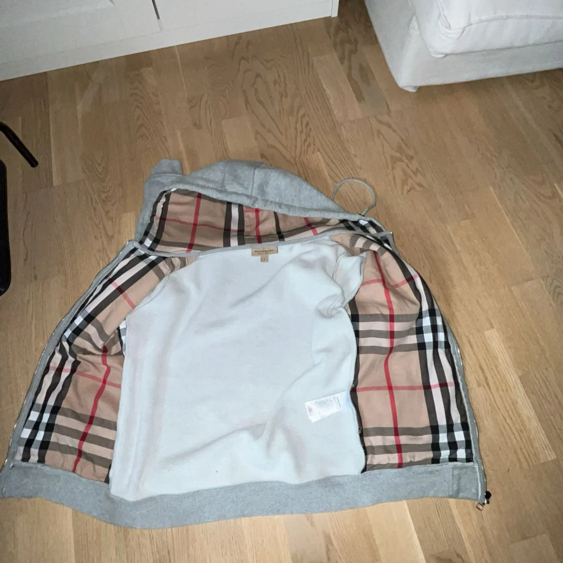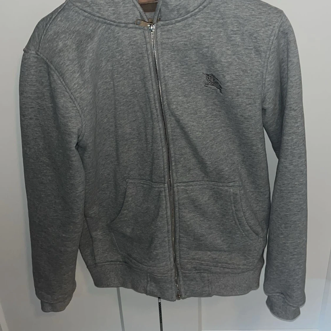 Grå hoodie från Burberry med klassiskt rutigt foder på insidan och broderad ryttare på bröstet. Tröjan har huva, dragkedja framtill och två fickor. Perfekt för dig som vill ha en stilren och lyxig vardagslook.