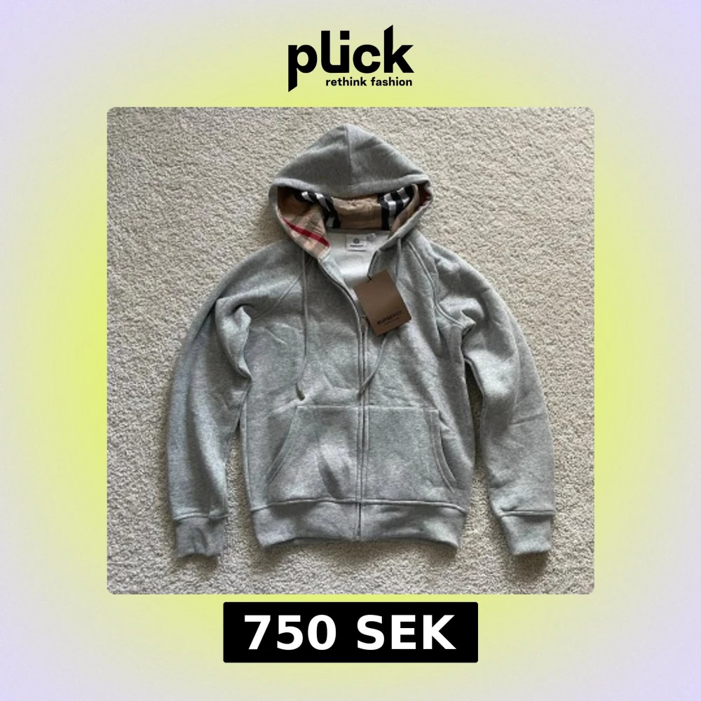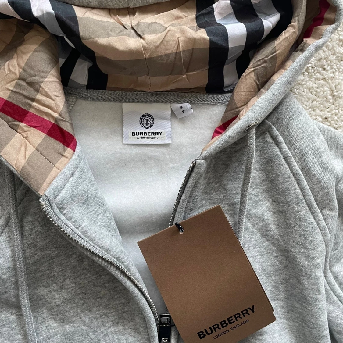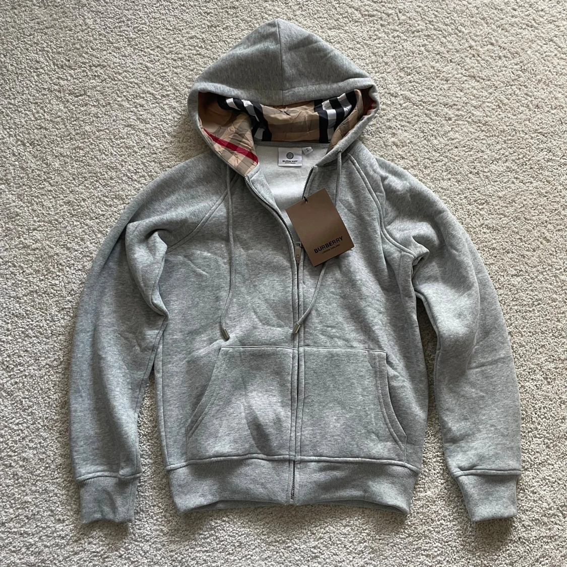 Snygg grå hoodie från Burberry med klassiskt rutigt foder i huvan. Tröjan har dragkedja framtill, snörning vid huvan och två stora fickor. Tillverkad i mjuk bomull och perfekt för chill dagar. Ikonisk Burberry-tag i nacken.