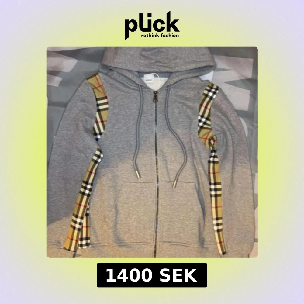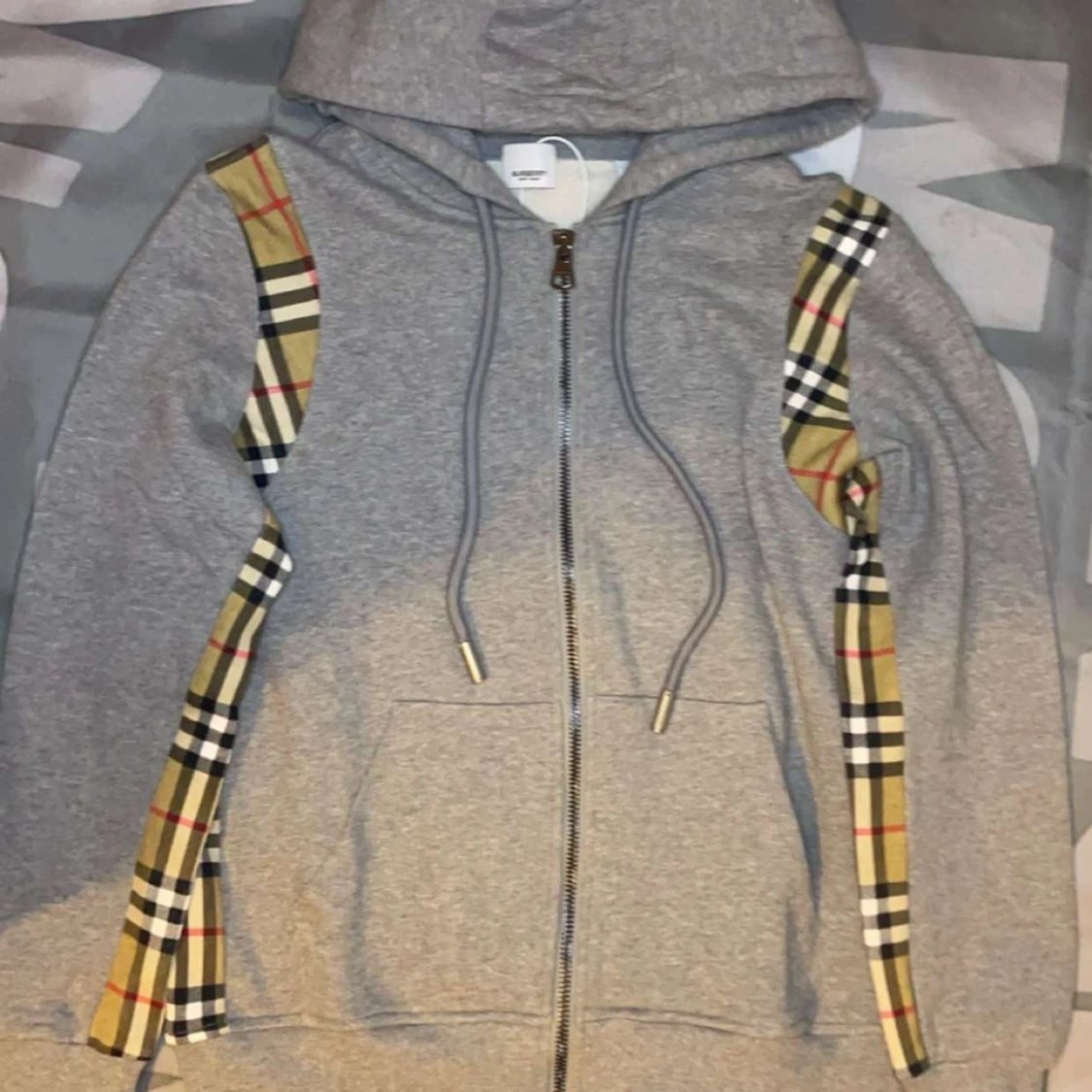 Snygg grå hoodie med dragkedja och rutiga detaljer längs ärmarna. Den har en justerbar huva med snören och en praktisk ficka framtill.