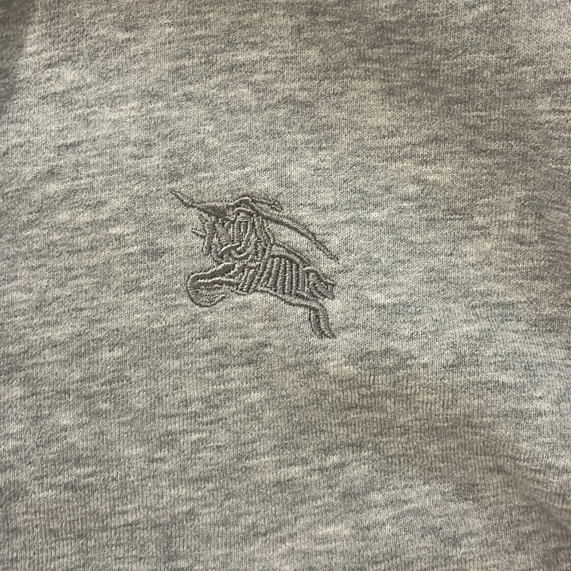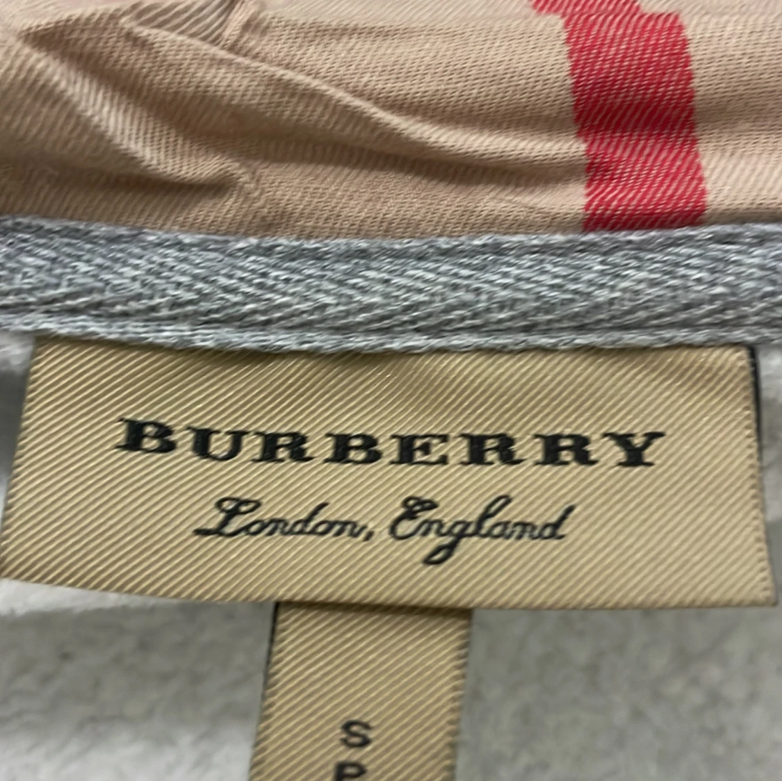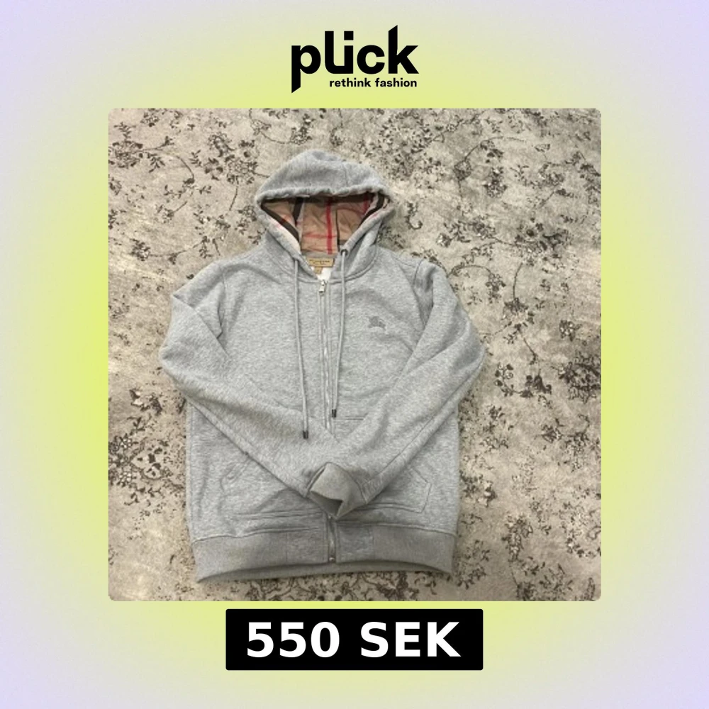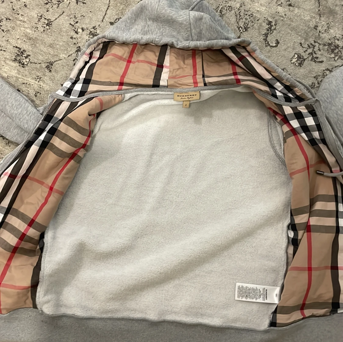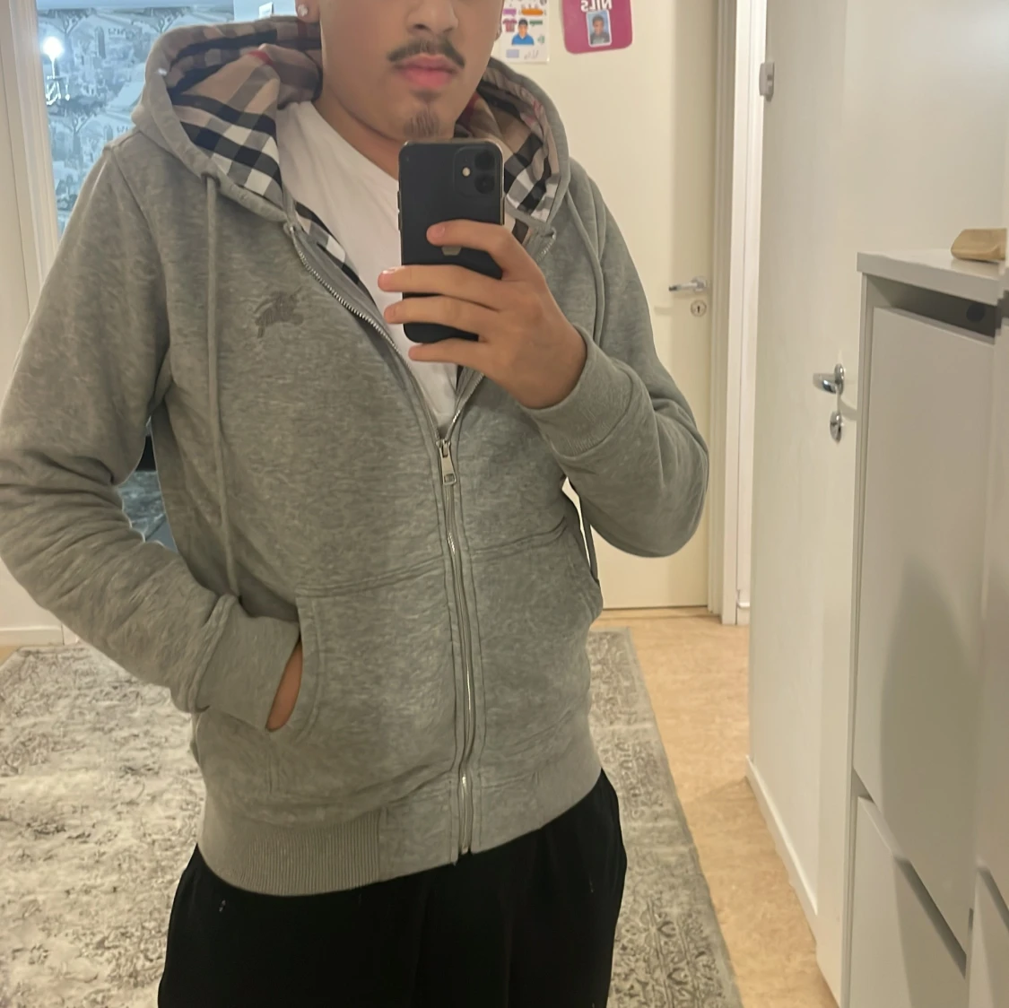 Säljer en stilren grå hoodie från Burberry med dragkedja och klassiskt rutigt foder i huvan. Tröjan har en broderad logotyp på bröstet och justerbara snören i huvan. Perfekt för en avslappnad och trendig look.