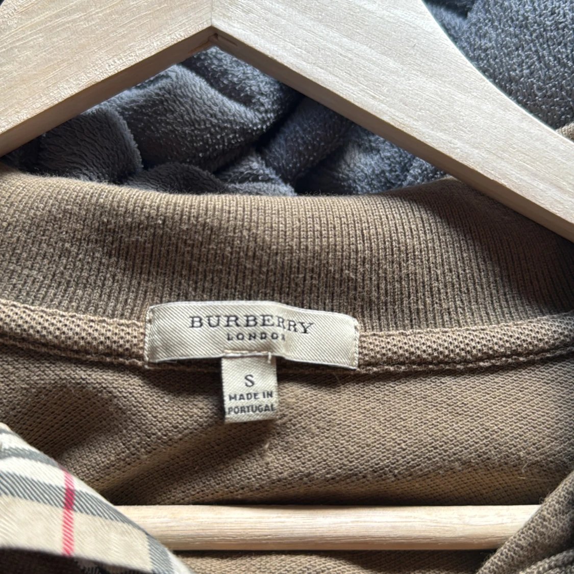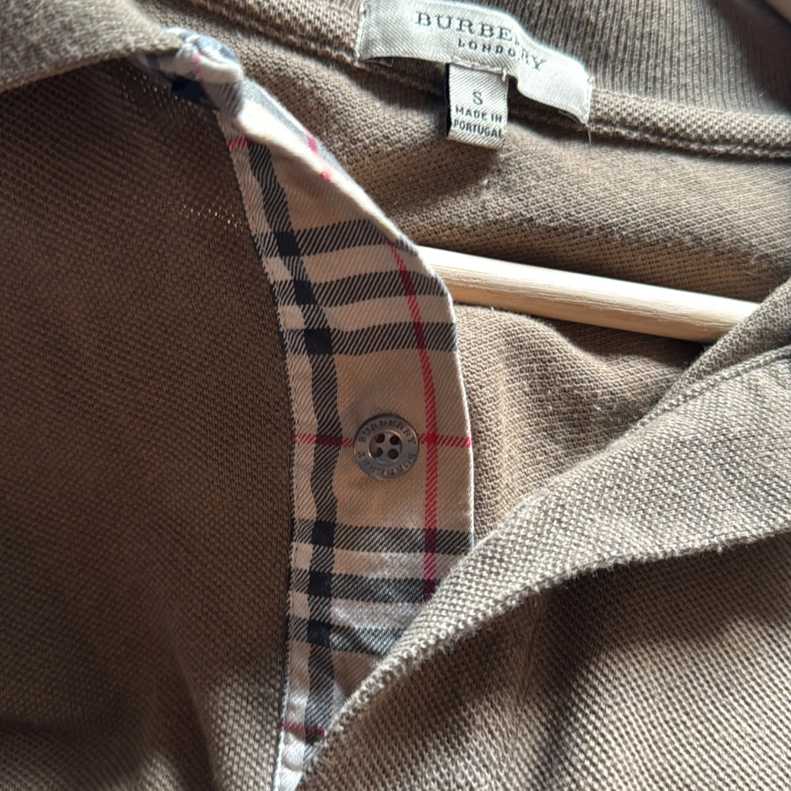 Säljer en brun pikétröja från Burberry i klassisk modell med rutiga detaljer vid knäppningen och broderad logga på bröstet. Tröjan har krage, korta ärmar och är gjord i bomull. Perfekt för dig som gillar stilrena och tidlösa plagg. En knapp har gått av men kan fixa innan köp eller skicka med knapp!