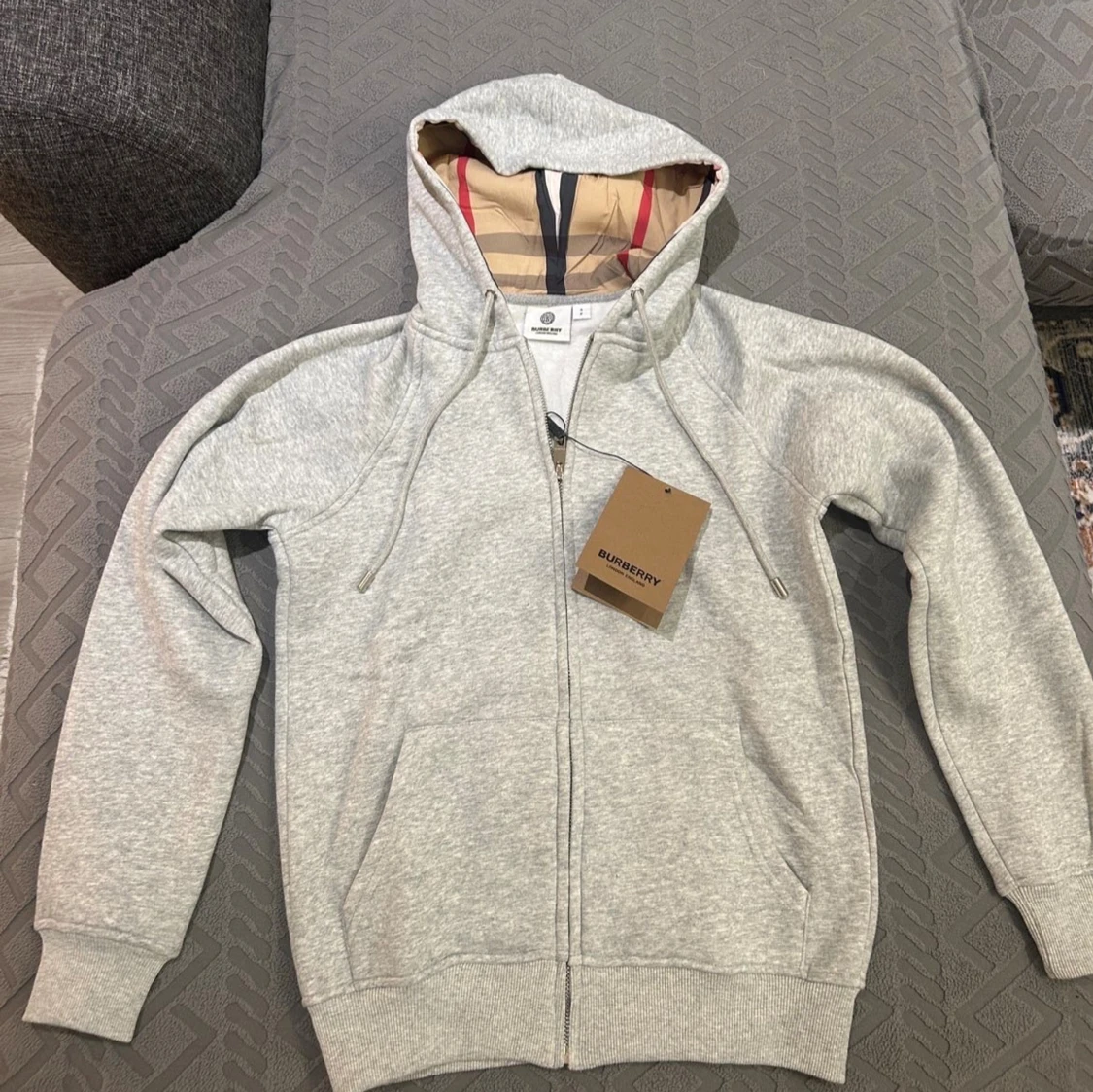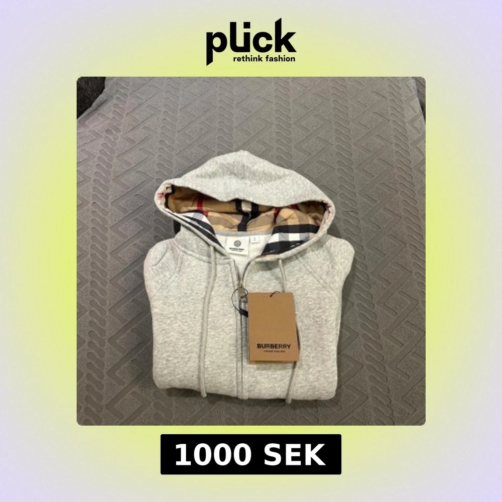 Snygg grå hoodie från Burberry med klassiskt rutigt foder i huvan. Tröjan har dragkedja framtill, snörning i huvan och två fickor. Perfekt för dig som vill ha en stilren och lyxig look med ikoniska Burberry-detaljer. STORLEKEN ÄR S MEN KÄNNS SOM XS