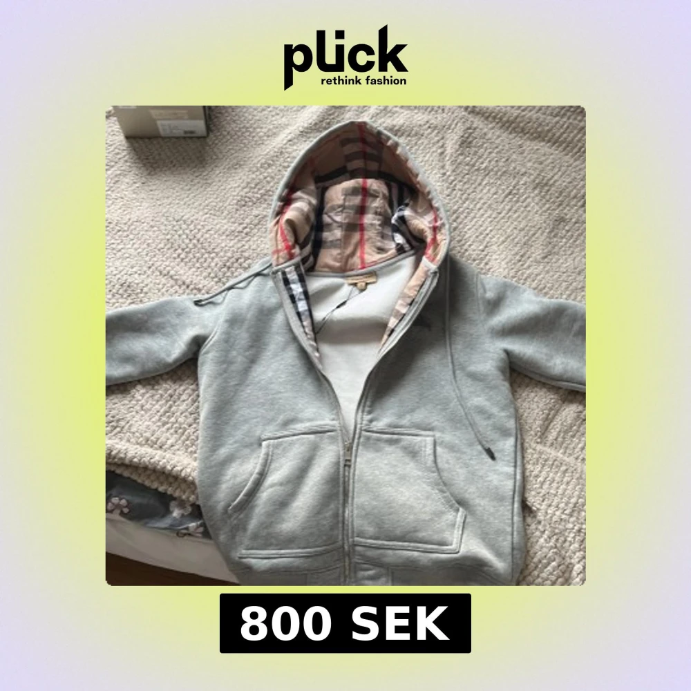 Säljer en grå hoodie från Burberry med klassiskt rutigt foder i huvan och broderad logga på bröstet. Tröjan har dragkedja, snörning i huvan och två stora fickor framtill. Mjuk insida och ribbade muddar för extra komfort.