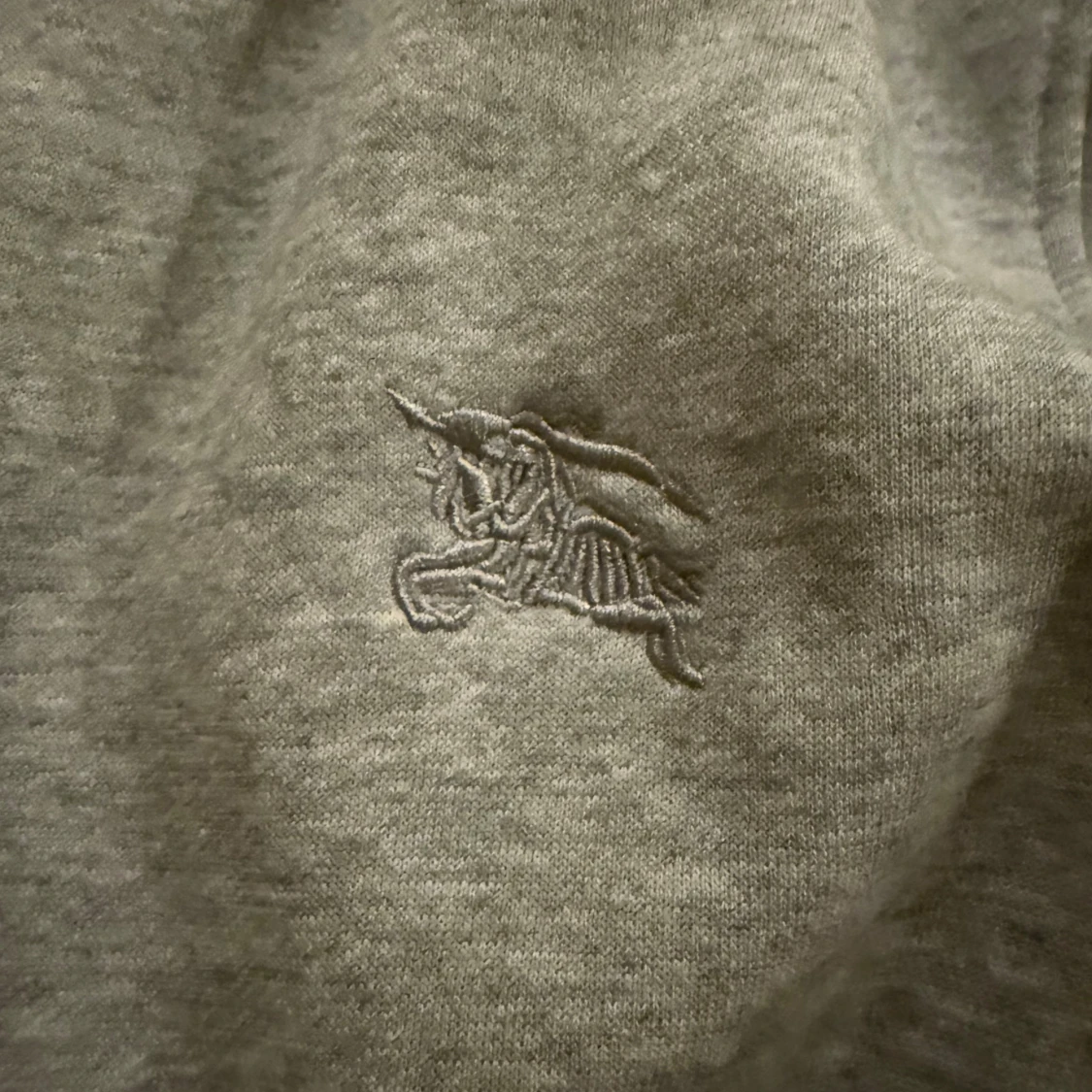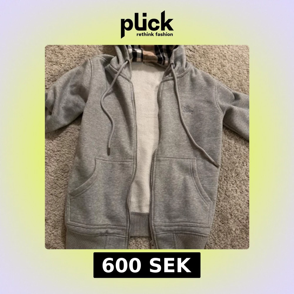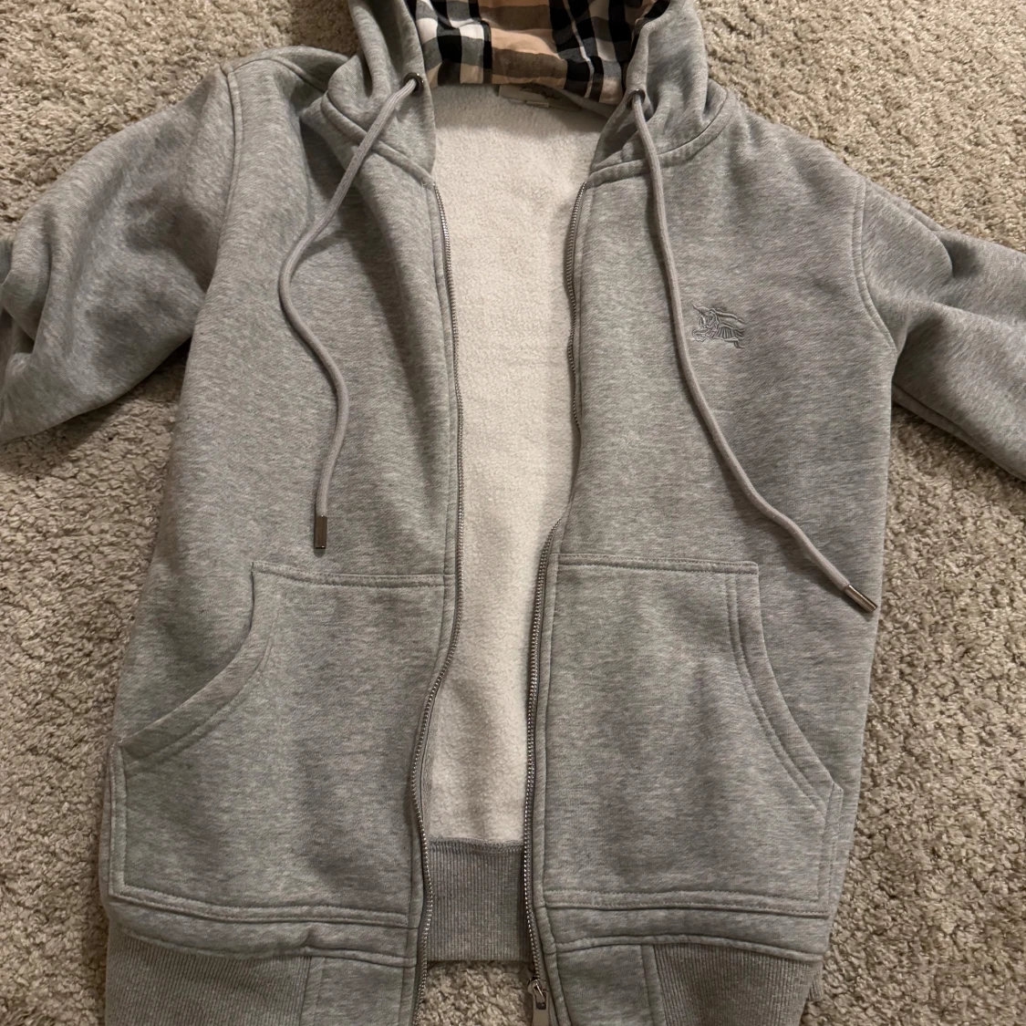 Säljer en grå hoodie från Burberry i storlek S. Tröjan har dragkedja, snörning och huva med klassiskt Burberry-rutigt foder i beige, svart och rött. Broderad logga på bröstet och två fickor framtill. Perfekt för dig som gillar stilrena och lyxiga detaljer. OBS zippern funkar inte men går att fixa