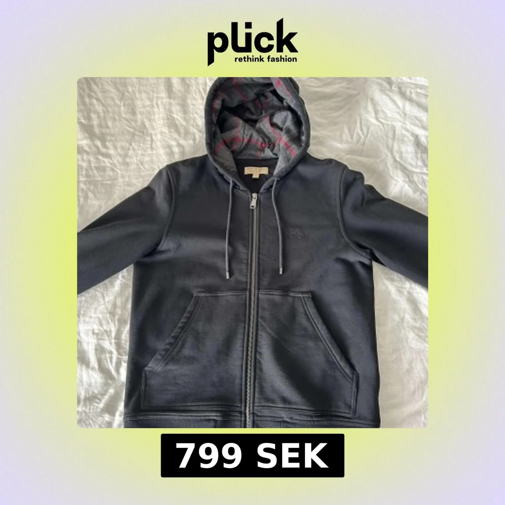 Snygg svart hoodie från Burberry med dragkedja och broderad logga på bröstet. Insidan av huvan har ett klassiskt rutigt mönster i grått och rött. Perfekt för en stilren och bekväm look.