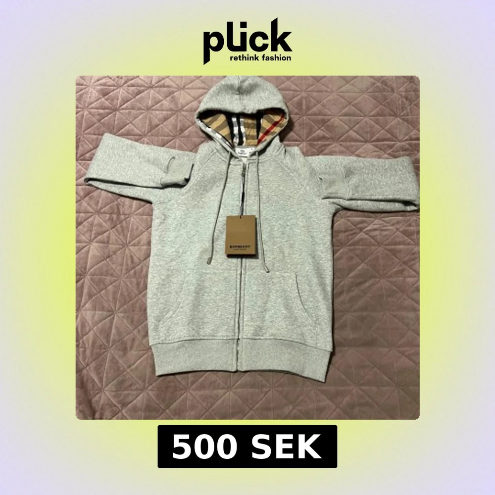 Snygg grå hoodie från Burberry med klassiskt rutigt foder i huvan och broderad logga på bröstet. Tröjan har dragkedja framtill, snörning i huvan och ribbade muddar. Perfekt för en chill och stilren look.