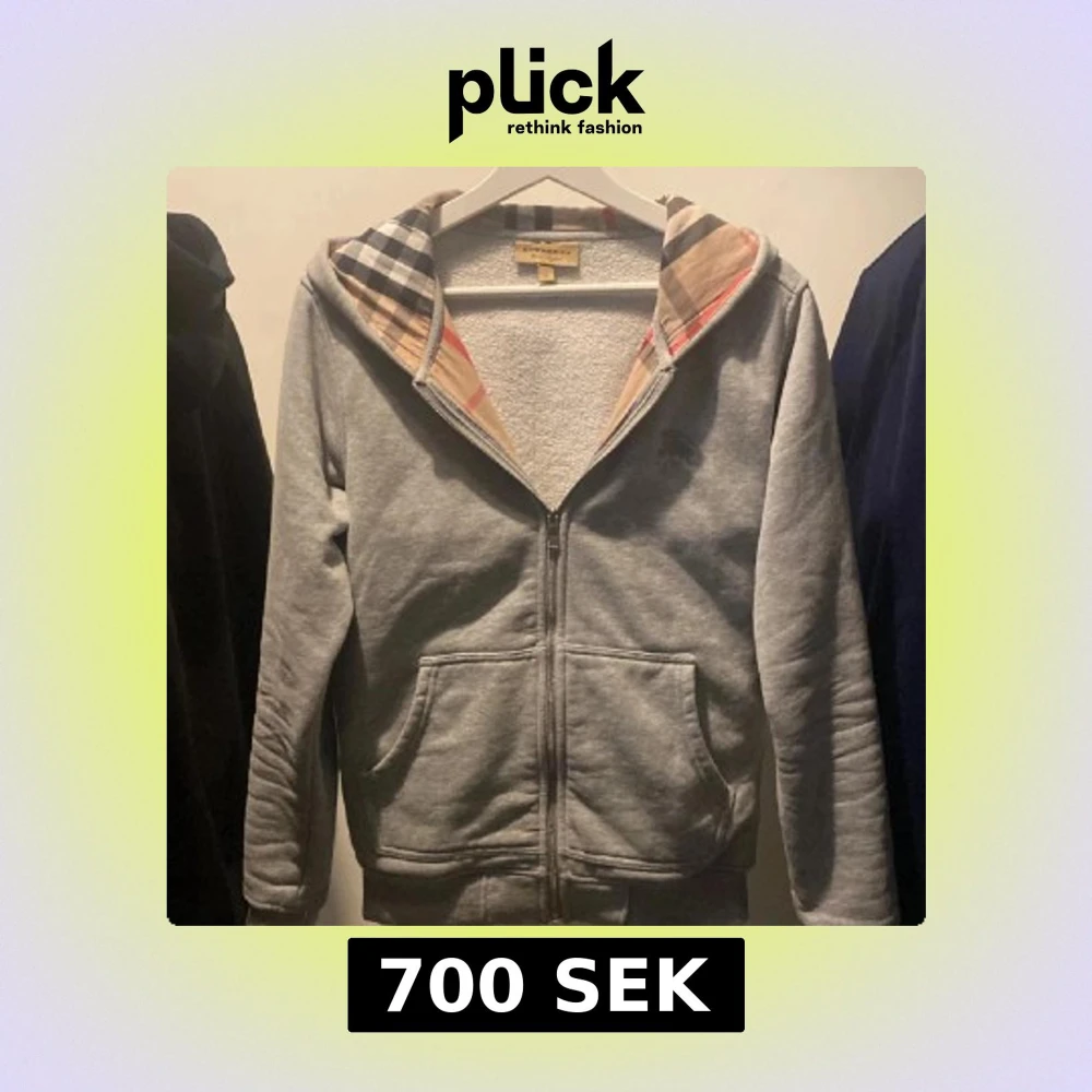 Säljer en grå hoodie från Burberry med klassiskt rutigt foder i huvan och broderad logga på bröstet. Tröjan har dragkedja framtill, två fickor och ribbade muddar. Perfekt för en avslappnad och stilren look.