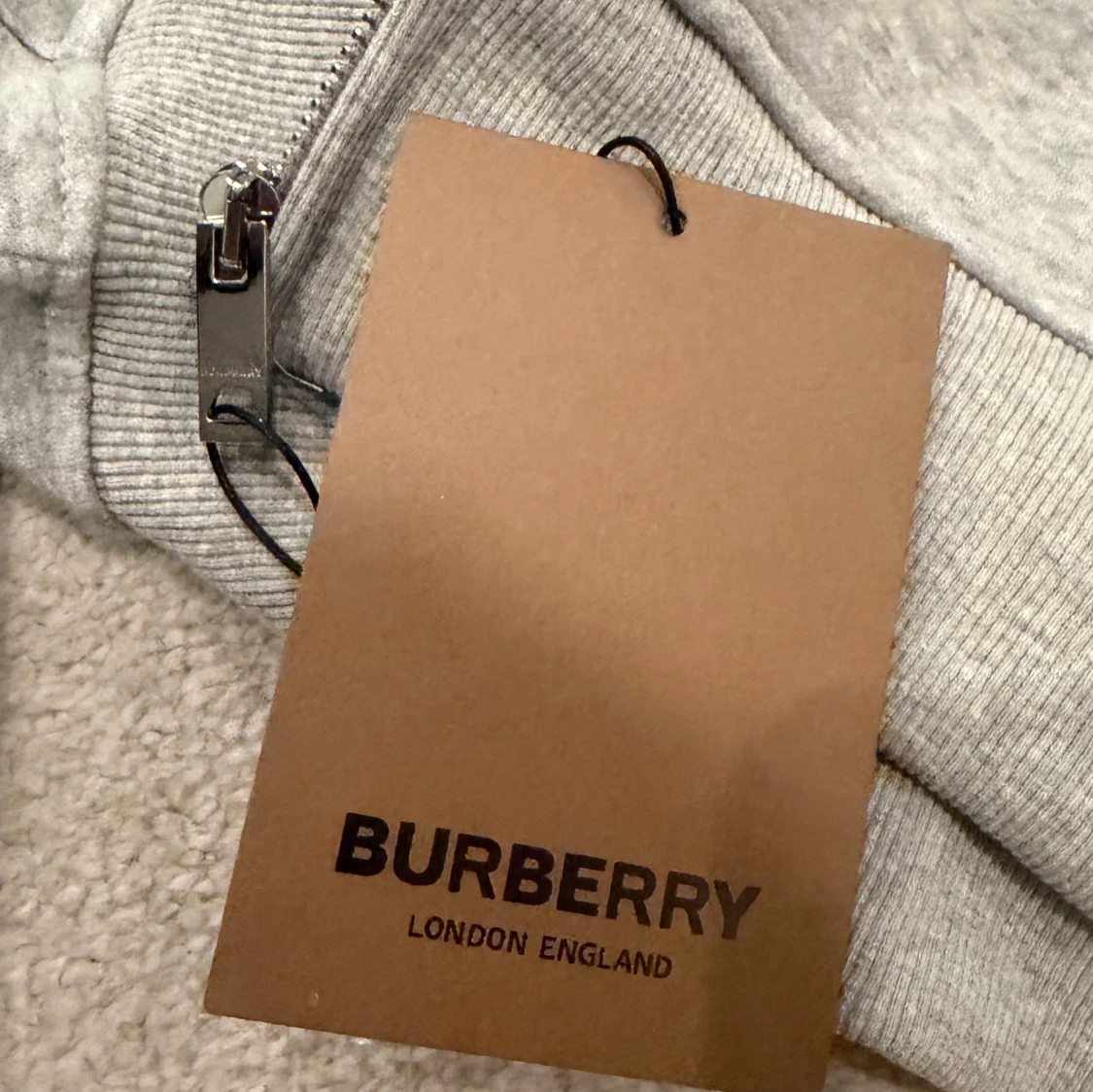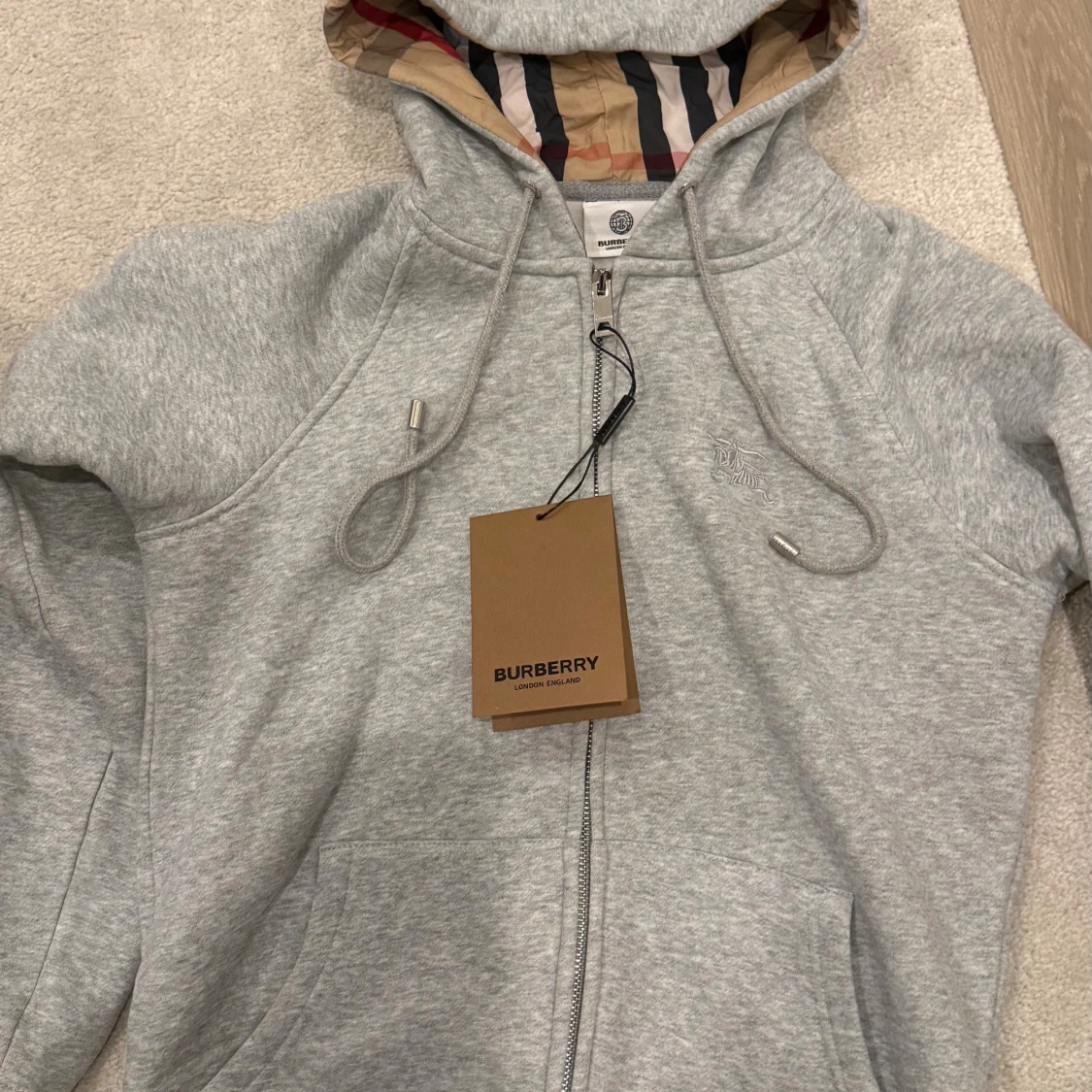 Grå hoodie från Burberry med klassisk rutmönstrad huva, broderad logga på bröstet och dragkedja framtill. Tröjan har snörning i huvan och är tillverkad i mjuk bomull. Perfekt för dig som gillar stilrena och exklusiva plagg.