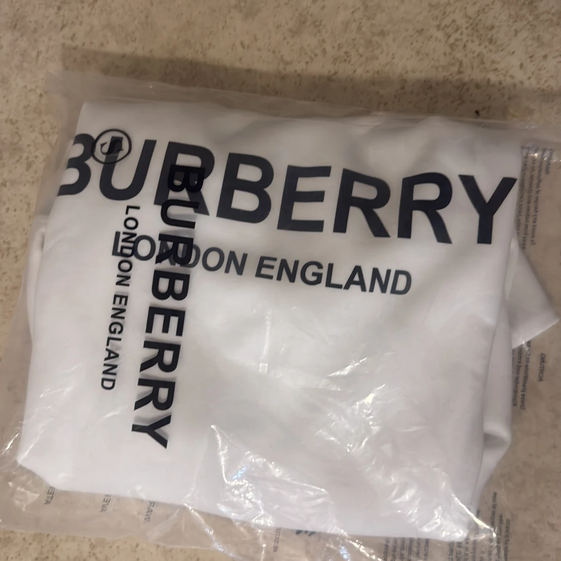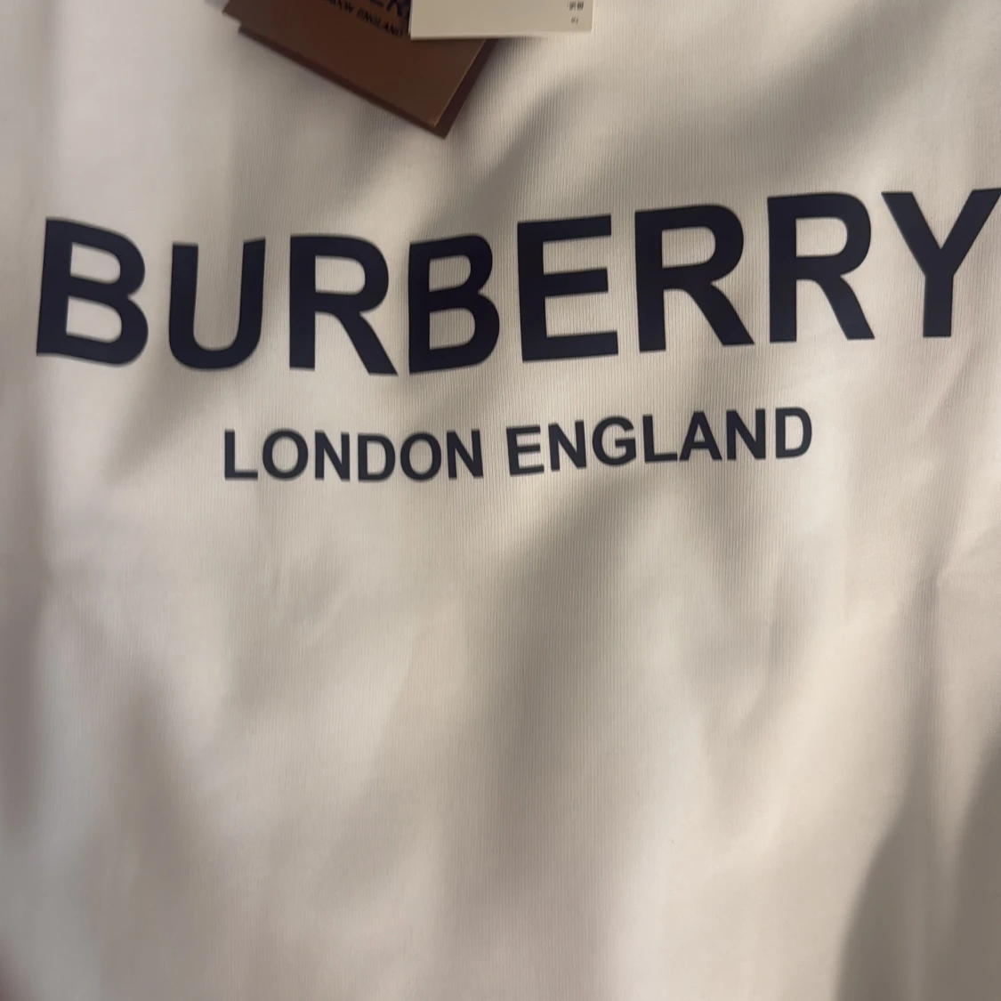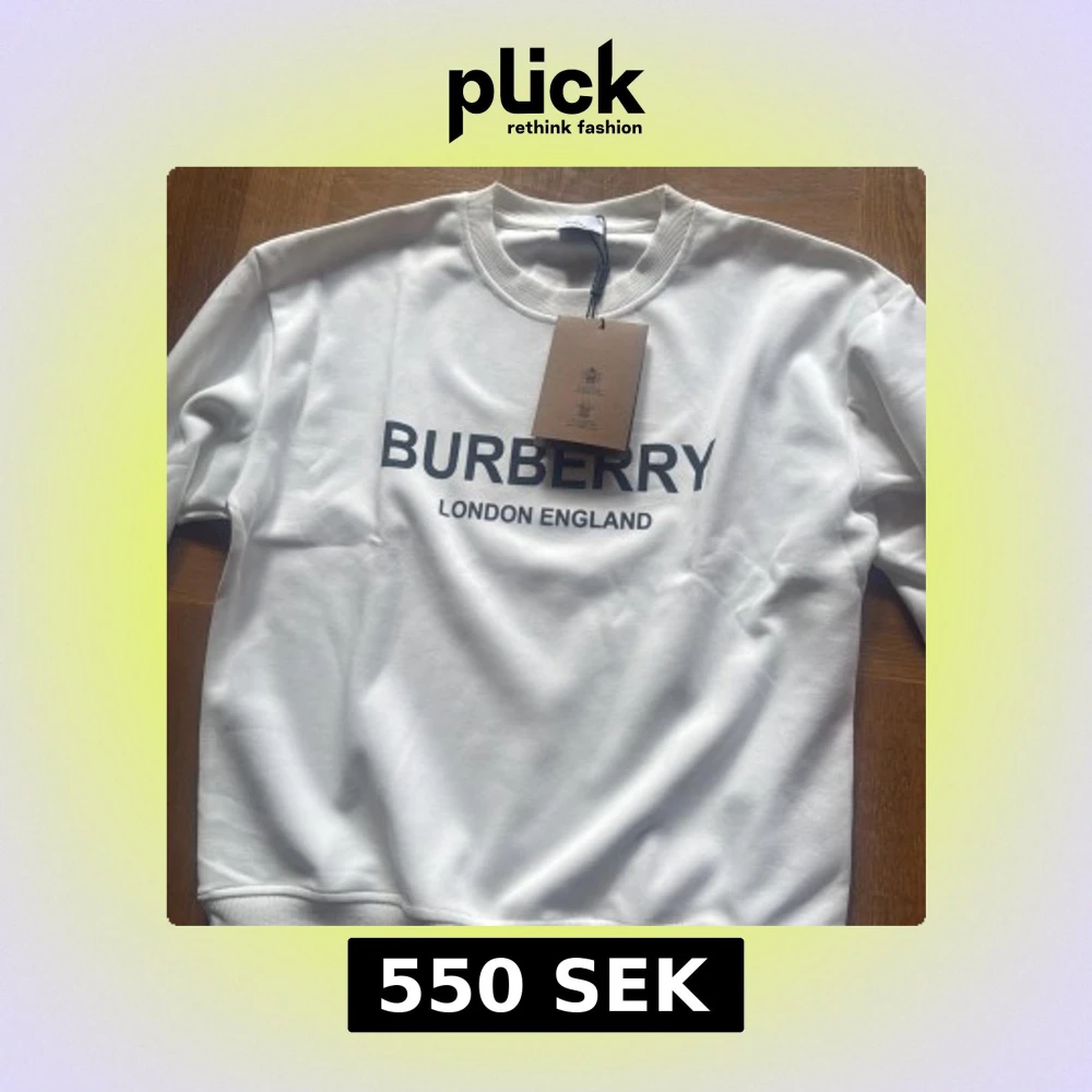 Vit sweatshirt från Burberry med svart tryck 'BURBERRY LONDON ENGLAND' på bröstet. Tröjan har rund hals, ribbade muddar och är tillverkad i mjuk bomull. Perfekt för dig som gillar stilrena och klassiska designer med en lyxig touch. Helt ny men säljer för den inte passar mig. Påse ingår.