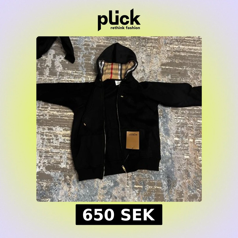 Svart hoodie från Burberry i storlek XL med klassiskt rutigt foder i huvan. Tröjan har dragkedja, snörning i huvan och fickor framtill. Guldiga detaljer på snörningen och dragkedjan ger en lyxig känsla. Perfekt för dig som vill ha en stilren och exklusiv look.