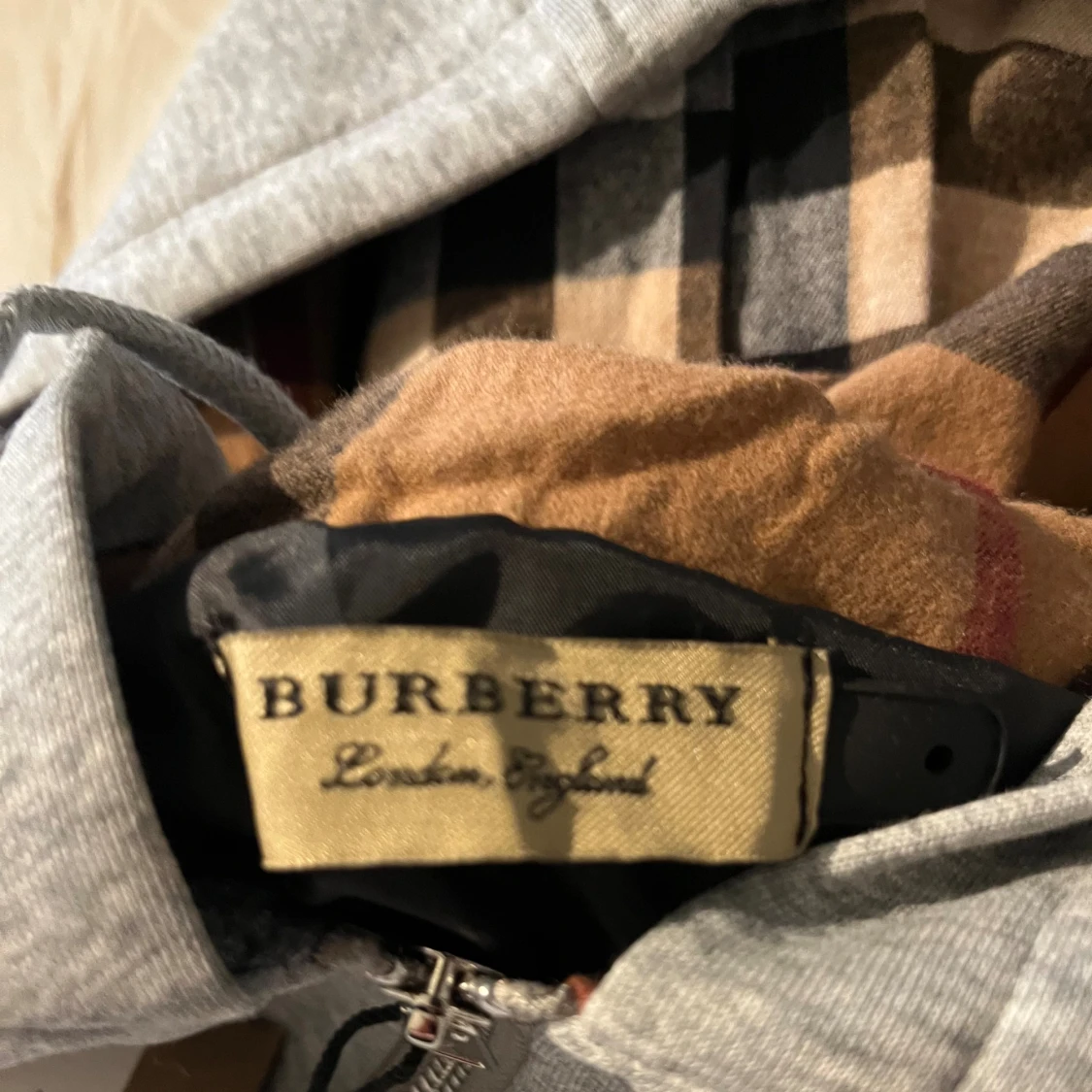 Snygg grå hoodie från Burberry i storlek XS. Tröjan har dragkedja, huva med snörning och broderad logga på bröstet. Tillverkad i mjuk bomullsmix och har ribbade muddar samt fickor framtill. Perfekt för en chill och stilren look.
