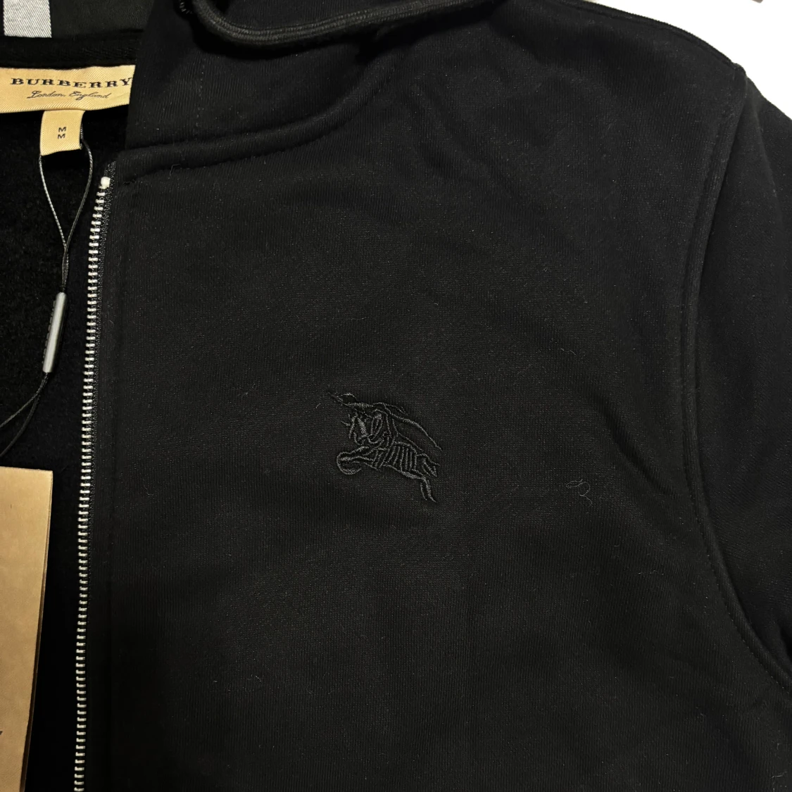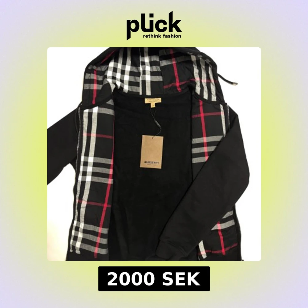 Svart kofta från Burberry med klassiskt rutigt foder i svart, vitt och rött. Koftan har huva, långa ärmar och dragkedja. Perfekt för de kommande kyliga dagar. Storleken är M. Skickas inom 24 timmar. (Nästan alltid samma dag).