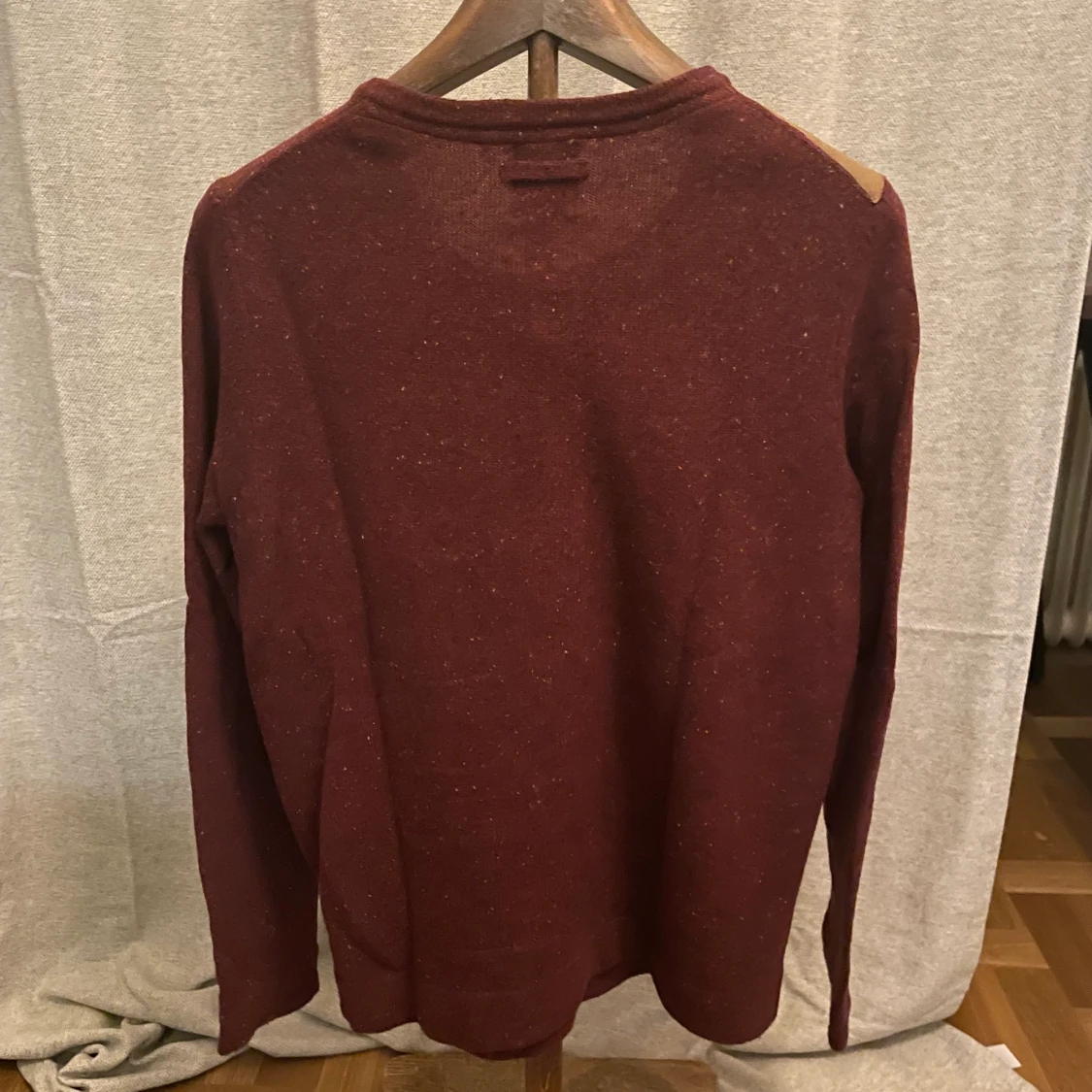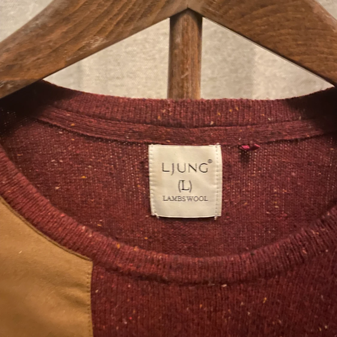 Knappt använd Ljung tröja i prickigt burgundy färg med brunt mocka över ena axeln köpt för ca 800kr
