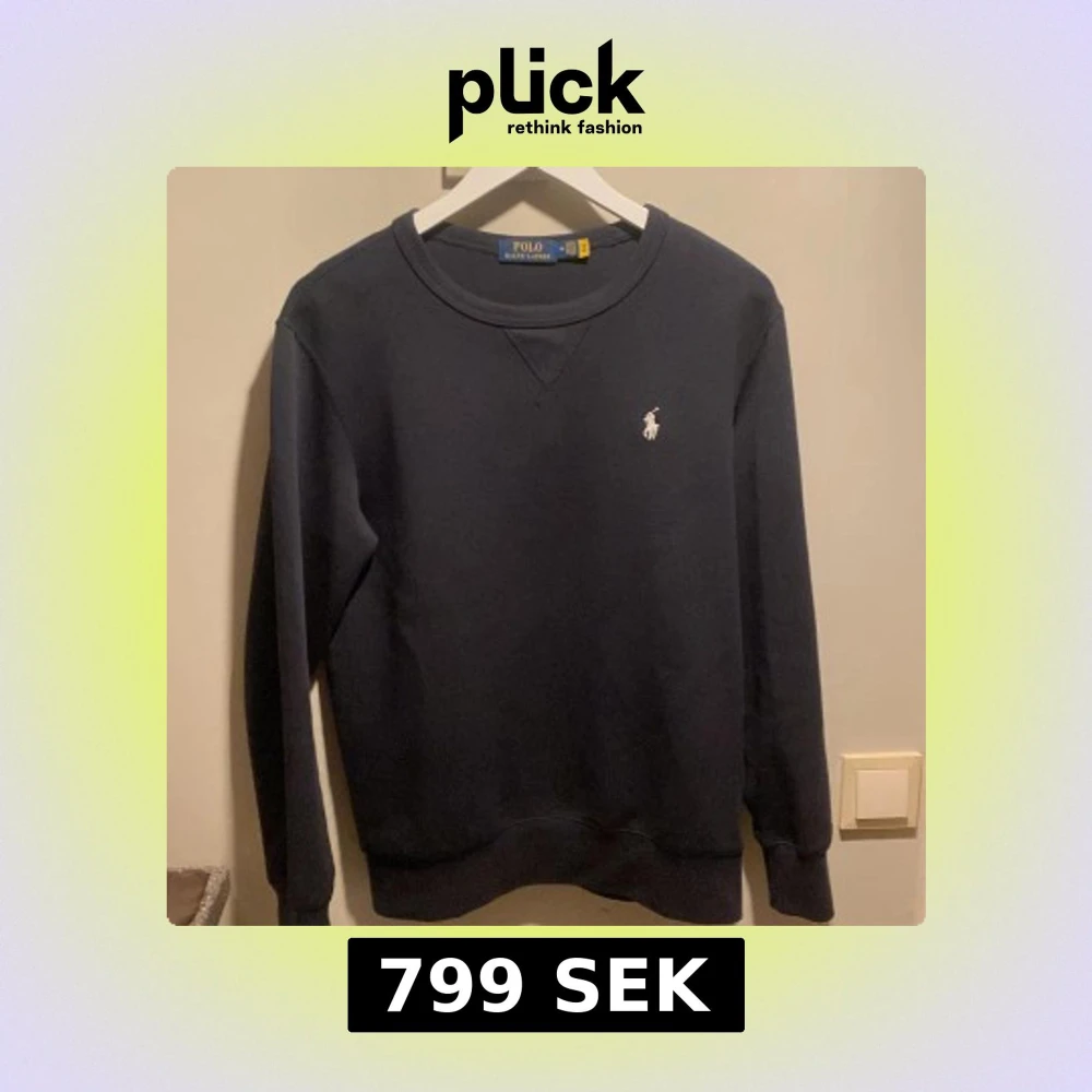 Säljer en stilren mörkblå tröja från Polo Ralph Lauren med det klassiska logotypbroderiet på bröstet. Tröjan har en rund halsringning och långa ärmar, perfekt för en avslappnad look.