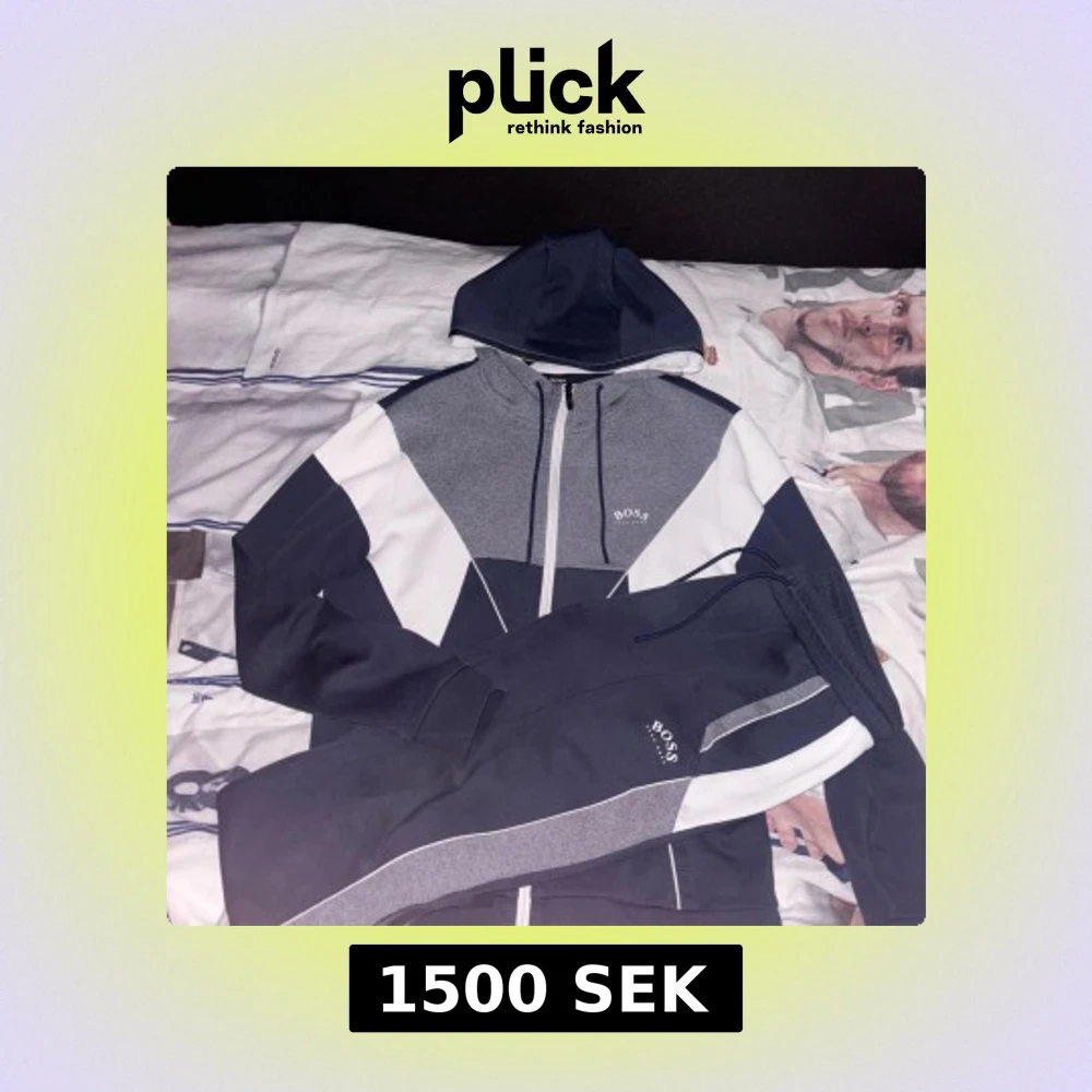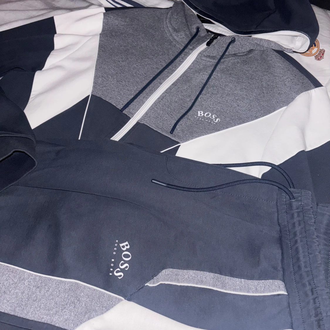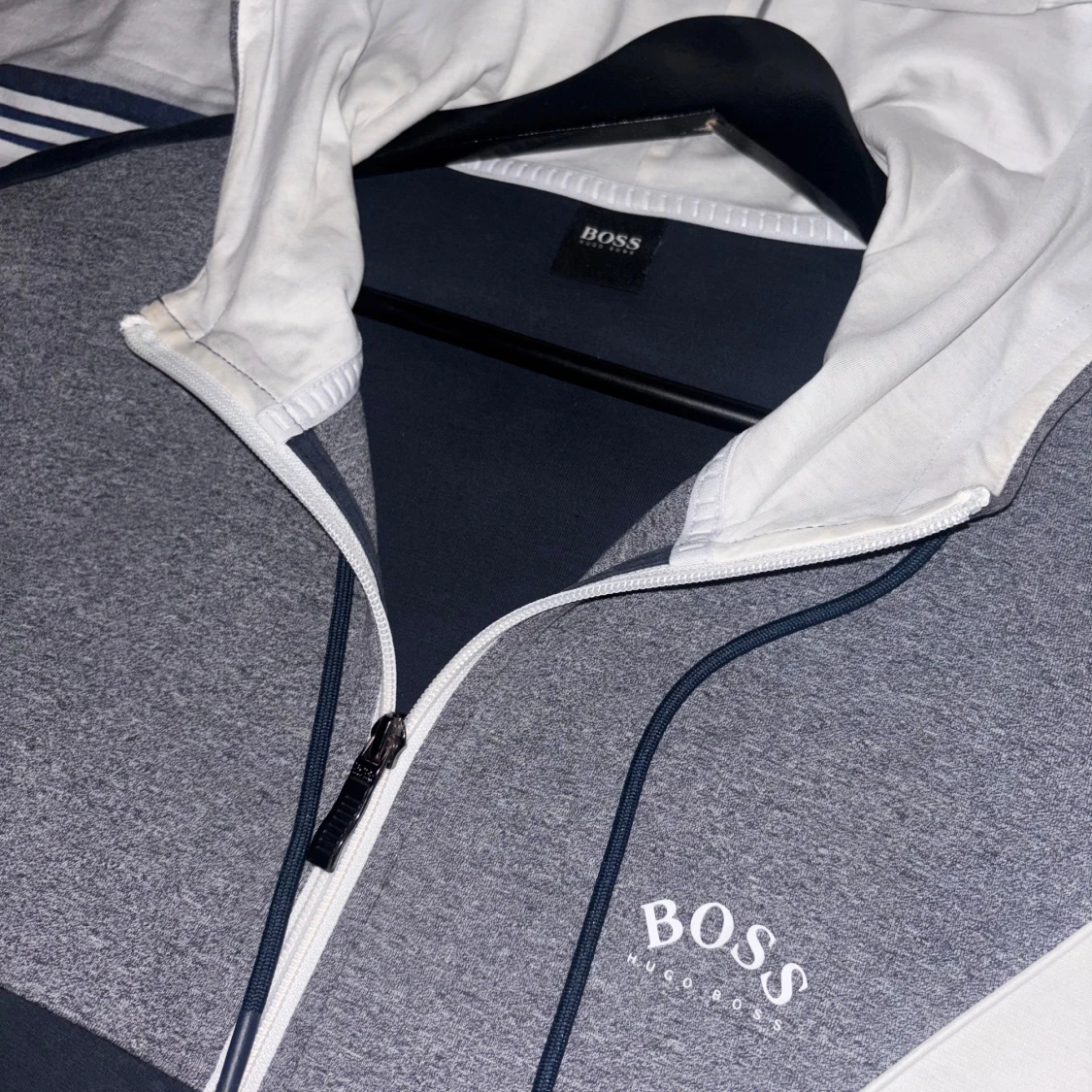 Snygg tracksuit från HUGO BOSS i färgblock med marinblå, grå och vita partier. Tröjan har huva med dragsko, hel dragkedja och BOSS-logga på bröstet. Perfekt för en chill och sportig stil. Materialet är mjukt och skönt, troligtvis bomullsmix. Priset kan diskuteras!!!