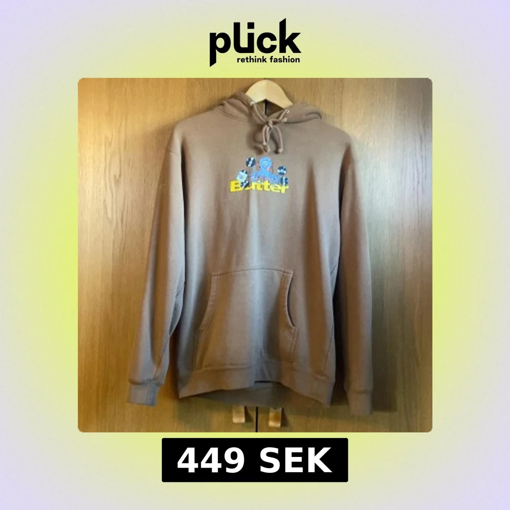 Säljer en brun hoodie från Butter med tecknat tryck och gul text på bröstet. Tröjan har huva med snörning, stor magficka och långa ärmar. Priset går att diskutera!