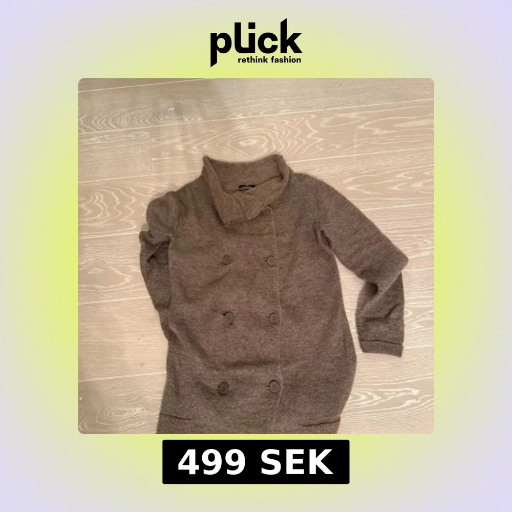 Säljer en snygg brun stickad kofta från Malene Birger. Koftan har en dubbelknäppt design med stora knappar och en hög krage. Perfekt för kyliga dagar och ger en stilren look. Passar bra till både jeans och kjol. Strl: XS