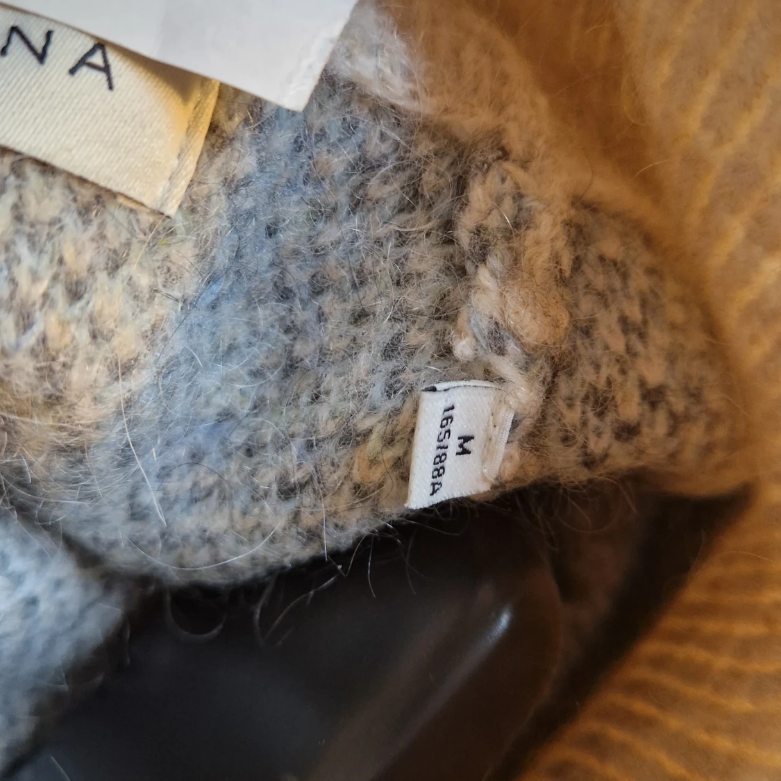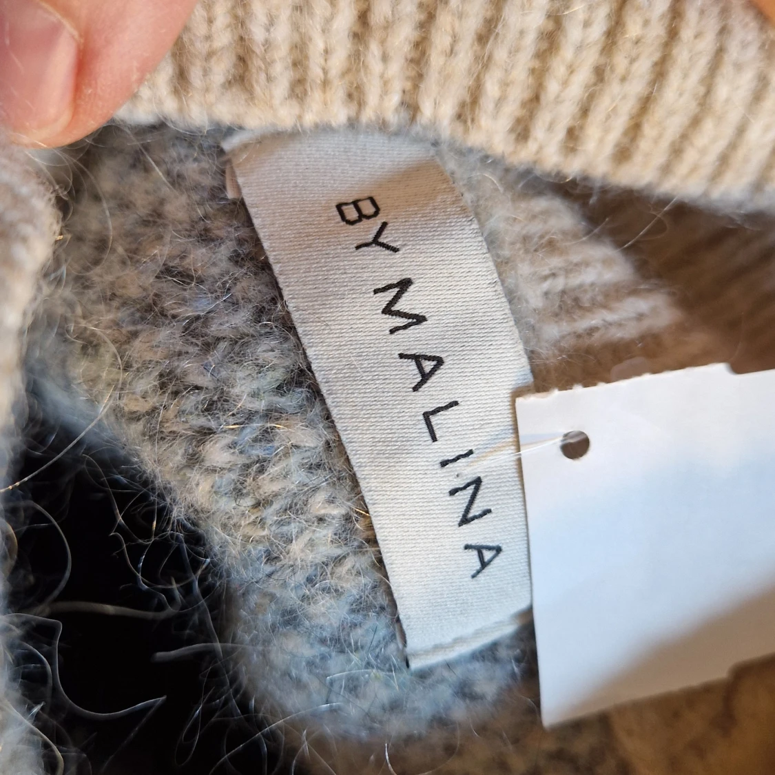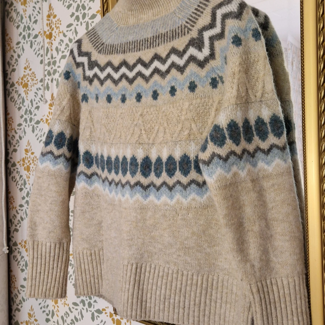 Supermysig varm beige polotröja från By Malina med stickat mönster i blått, grått och vitt. Tröjan har hög krage, lång ärm och ribbade muddar. Materialmix med ull, mohair och återvunnen polyester ger en fluffig och varm känsla. Perfekt för kalla dagar! Inga anmärkningar, mycket fint skick utan noppor.