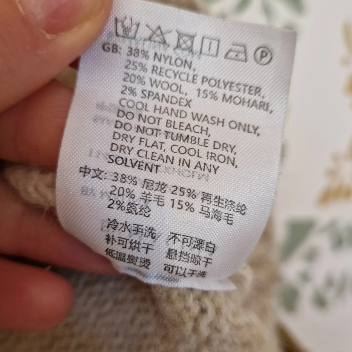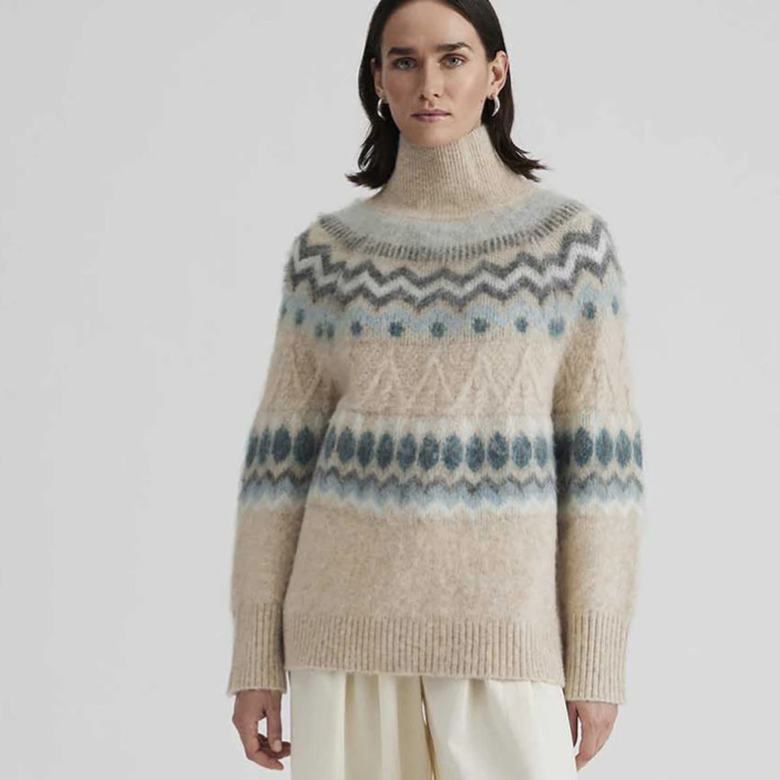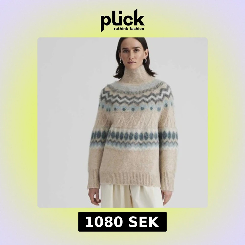 Supermysig varm beige polotröja från By Malina med stickat mönster i blått, grått och vitt. Tröjan har hög krage, lång ärm och ribbade muddar. Materialmix med ull, mohair och återvunnen polyester ger en fluffig och varm känsla. Perfekt för kalla dagar! Inga anmärkningar, mycket fint skick utan noppor.