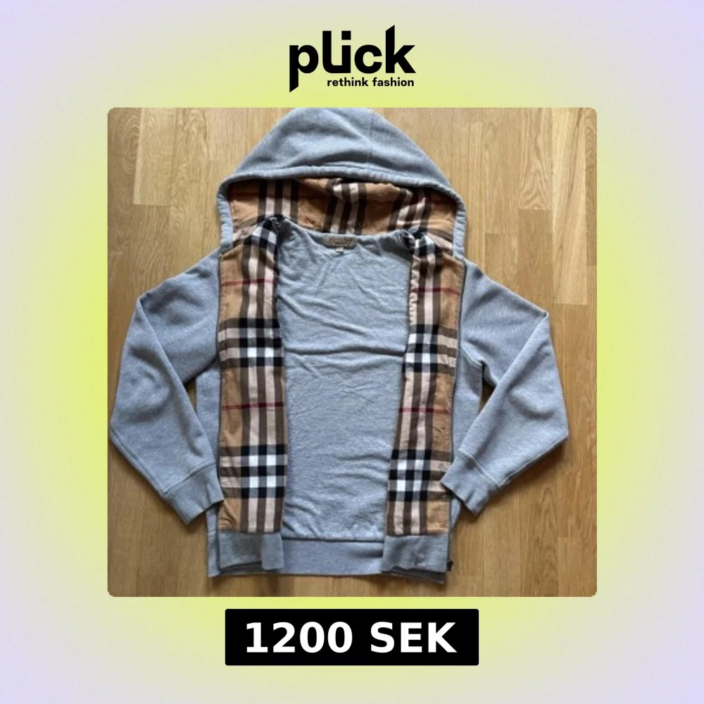 Säljer en grå hoodie från Burberry med dragkedja och ikoniskt beige, svart och röd rutigt foder i huvan och längs insidan. | ev byte