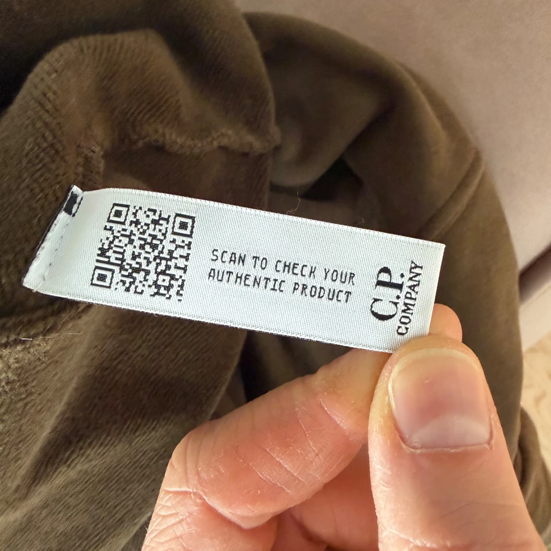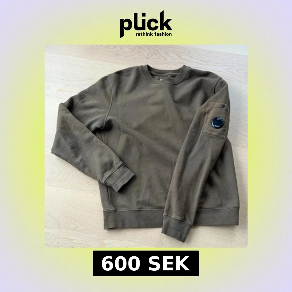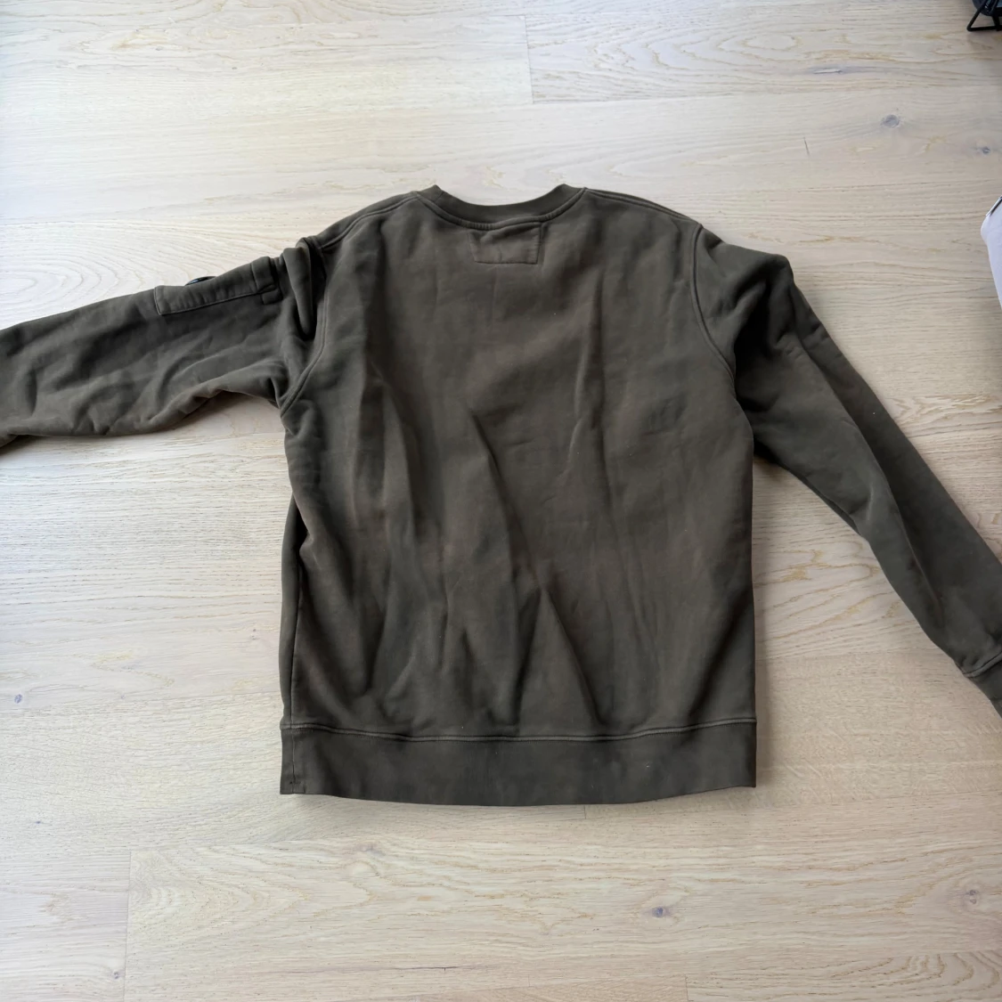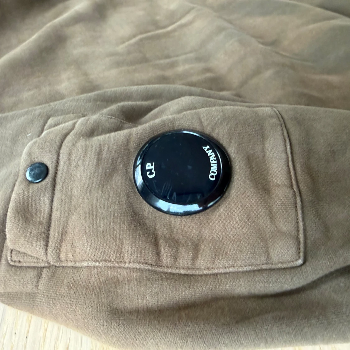 Säljer en brun sweatshirt från C.P. Company med deras ikoniska linsdetalj på ärmen. Tröjan har rund hals, ribbade muddar och en ficka med knapp på vänster ärm. Något solblekt på ställen, syns bara i vissa ljus. Lite flammig.