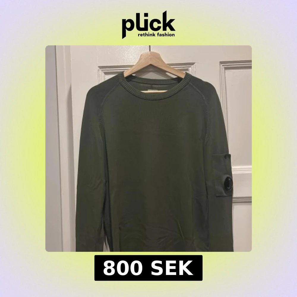 Snygg mörkgrön stickad tröja från C.P. Company med rund hals och lång ärm. Tröjan har en cool detalj med en svart lins på vänster ärm, typiskt för märket. Materialet är mjukt och skönt, perfekt för lager-på-lager under hösten och vintern. Obs den har hål på baksidan!