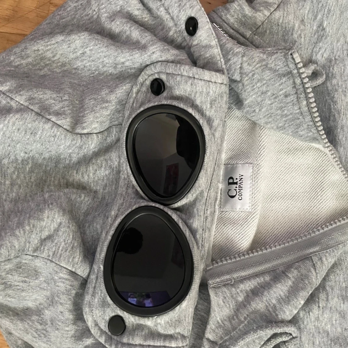 Säljer en grå hoodiejacka från C.P. Company med ikoniska goggles i huvan. Jackan har dragkedja framtill, ribbade muddar och är tillverkad i mjuk bomull. Perfekt för dig som vill ha en streetwear-look med unik detalj.