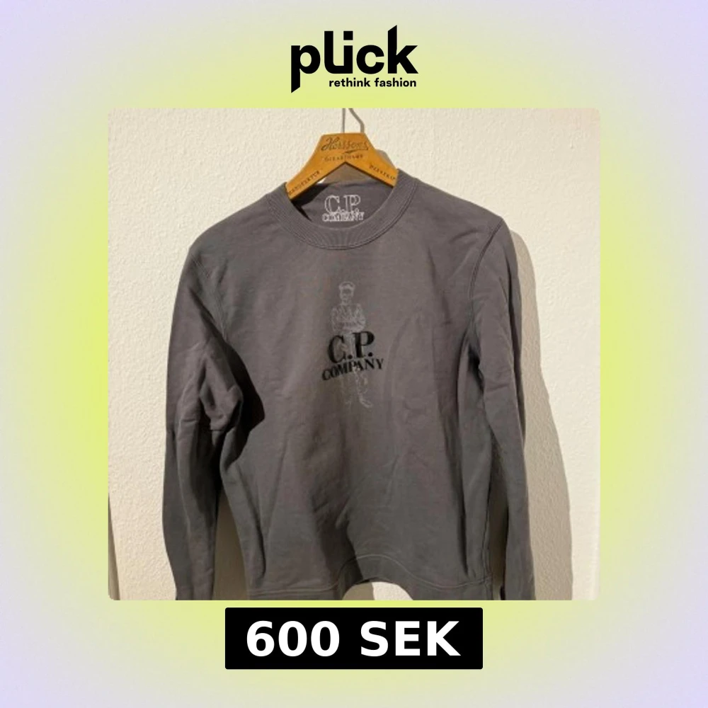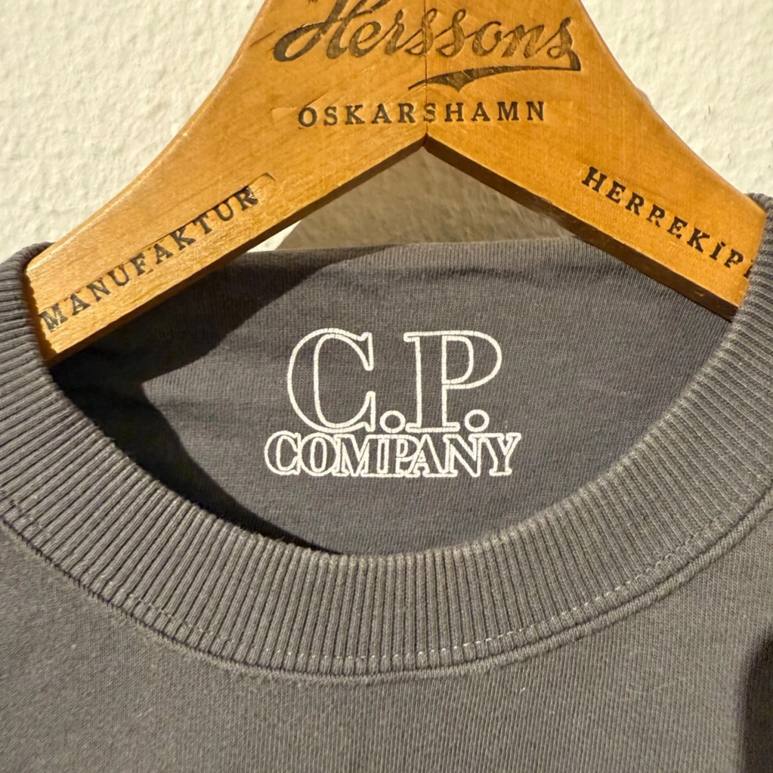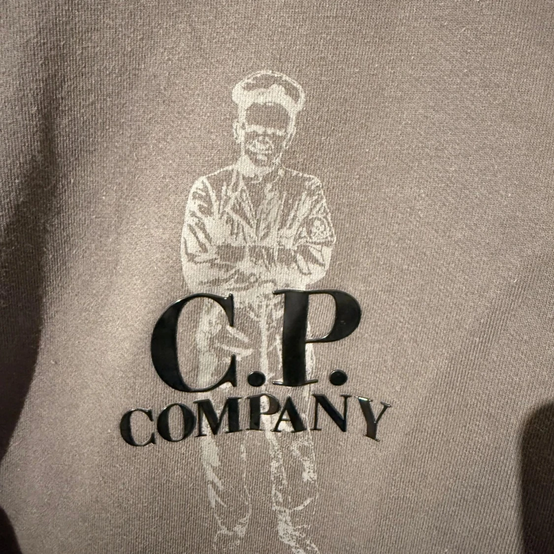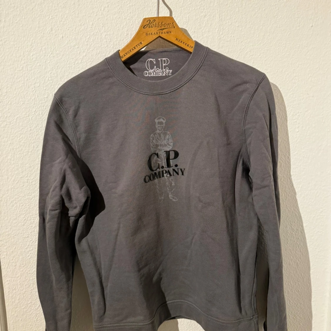 Snygg grå sweatshirt från C.P. Company med tryckt motiv av en person och tydlig logga på bröstet. Storlek S