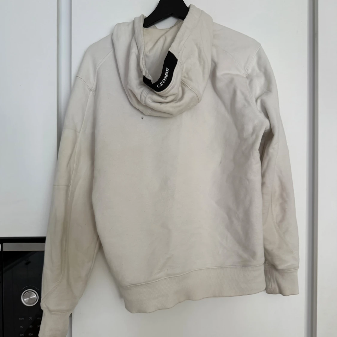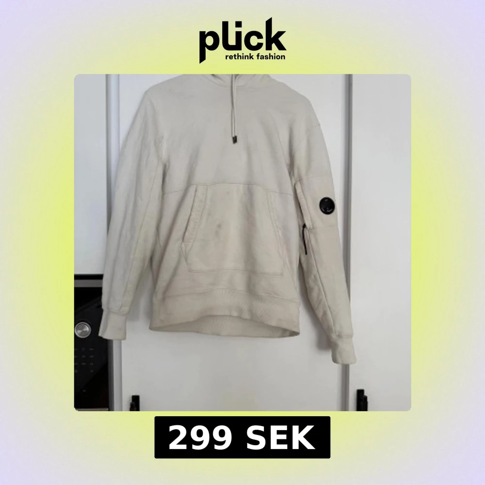 Säljer en stilren vit hoodie från C.P. Company med klassisk huva och snörning. Tröjan har en stor magficka och en ikonisk svart linsdetalj på ärmen. Perfekt för dig som gillar streetwear och vill ha något bekvämt och snyggt.