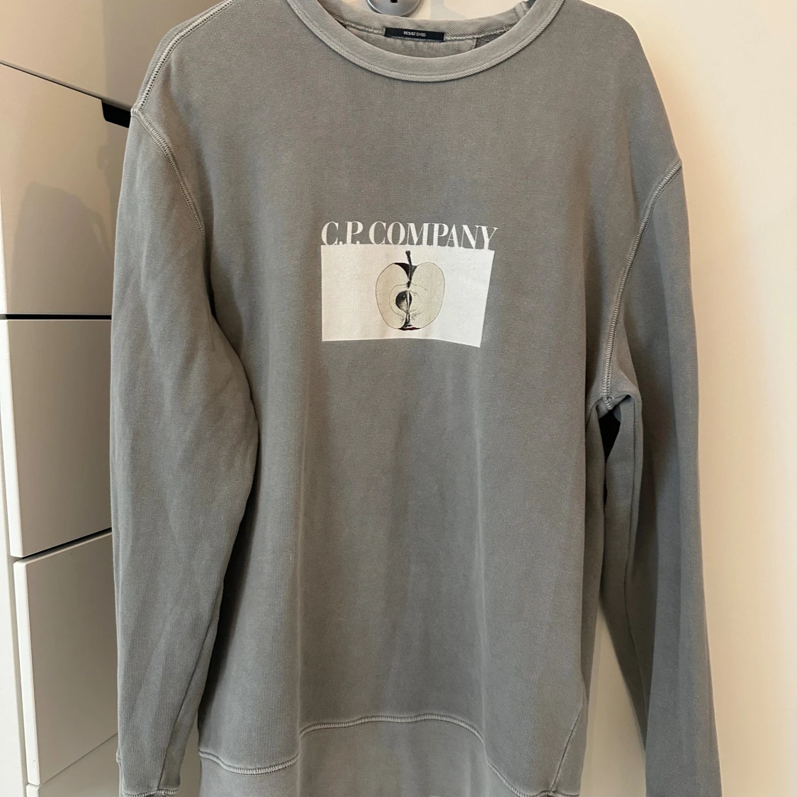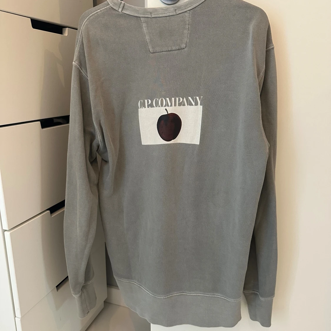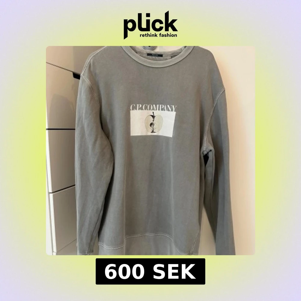 Snygg grå sweatshirt från C.P. Company med tryck av äpple och logga både fram och bak. Tröjan har rund hals och långa ärmar, perfekt för dig som gillar stilrena och coola plagg. Materialet är mjukt och skönt, passar till jeans eller cargo. Inga defekter.