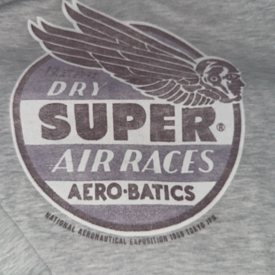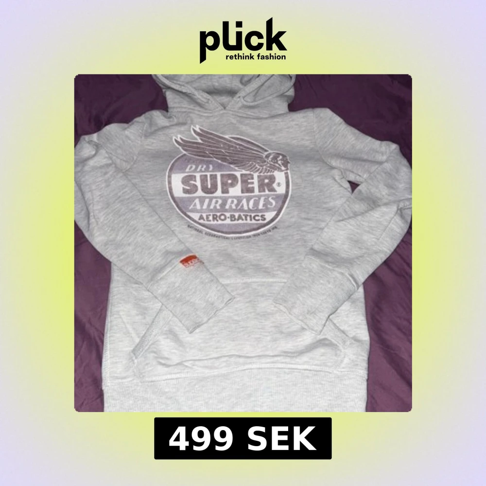 Snygg ljusgrå hoodie från Superdry i storlek XS. Tröjan har ett stort vintageinspirerat tryck på bröstet med texten 'Super Air Races Aero-Batics' och en cool vinge. Klassisk känguruficka och huva med dragsko. Perfekt för chill dagar. Köpt för 699 säljer för 399 men kan gå ner i pris förstås