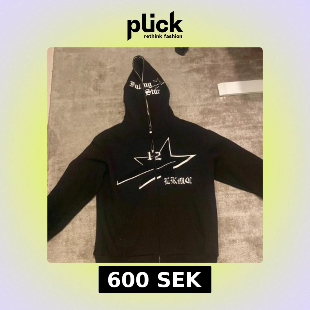 Säljer en svart hoodie från Lukomachain med ett stort vitt stjärnmotiv och text på framsidan. Hoodien har dragkedja och en stor luca med texten 'Falling Star'. Perfekt för en cool och avslappnad stil. Inte använd mycket alls, skick 9/10