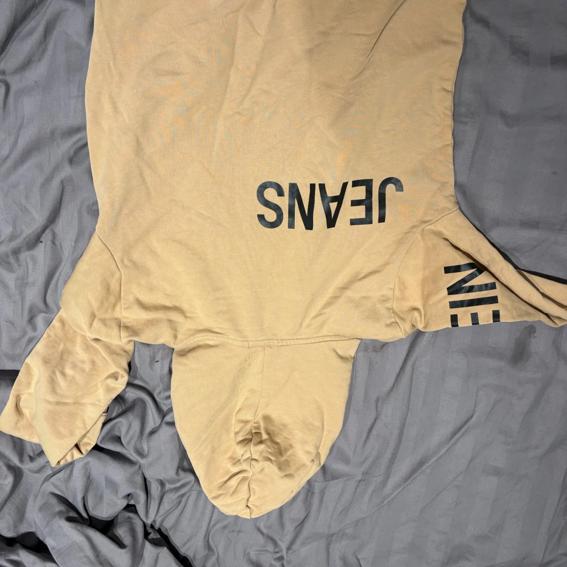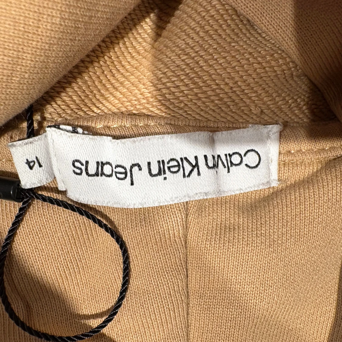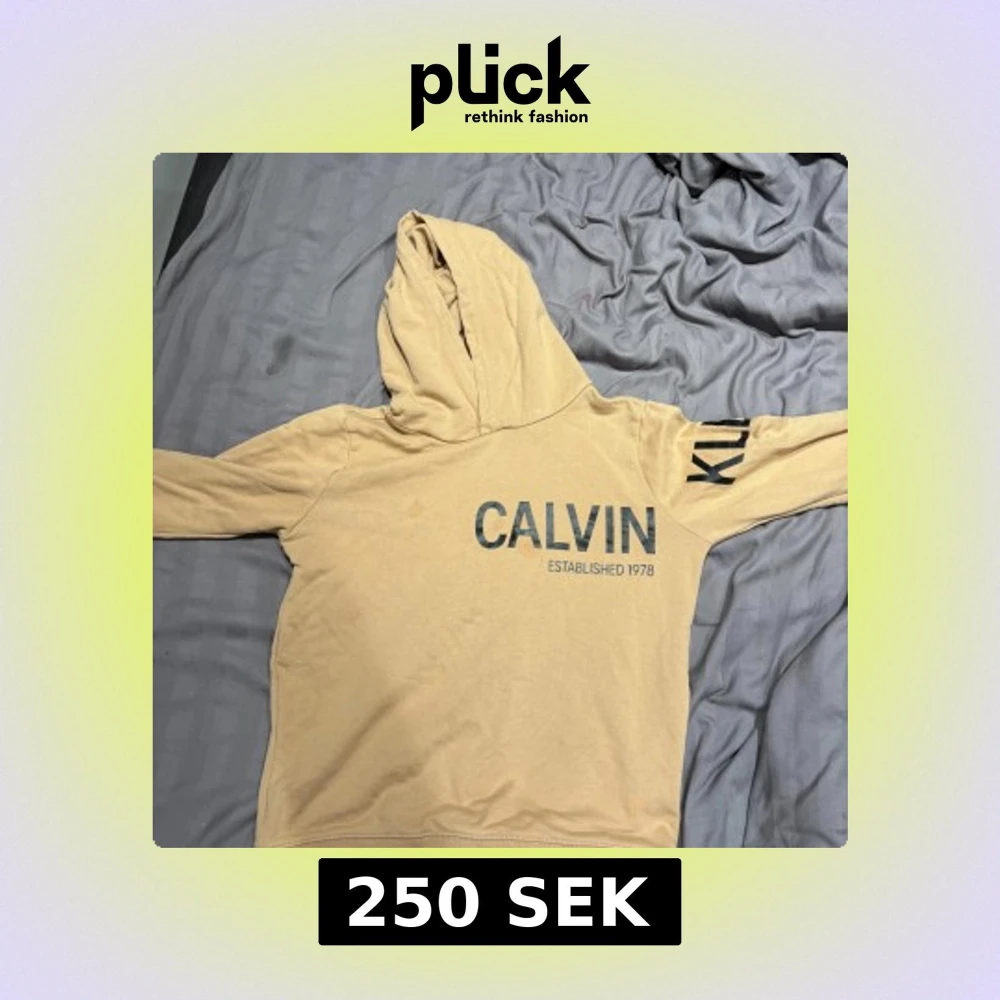 Snygg beige hoodie från Calvin Klein Jeans med svart tryck på bröstet och ärmen. Tröjan har huva och långa ärmar, perfekt för chill dagar. Materialet är mjukt och skönt bomullstyg. Stort CALVIN-tryck framtill och JEANS-tryck på ryggen ger en cool streetkänsla.