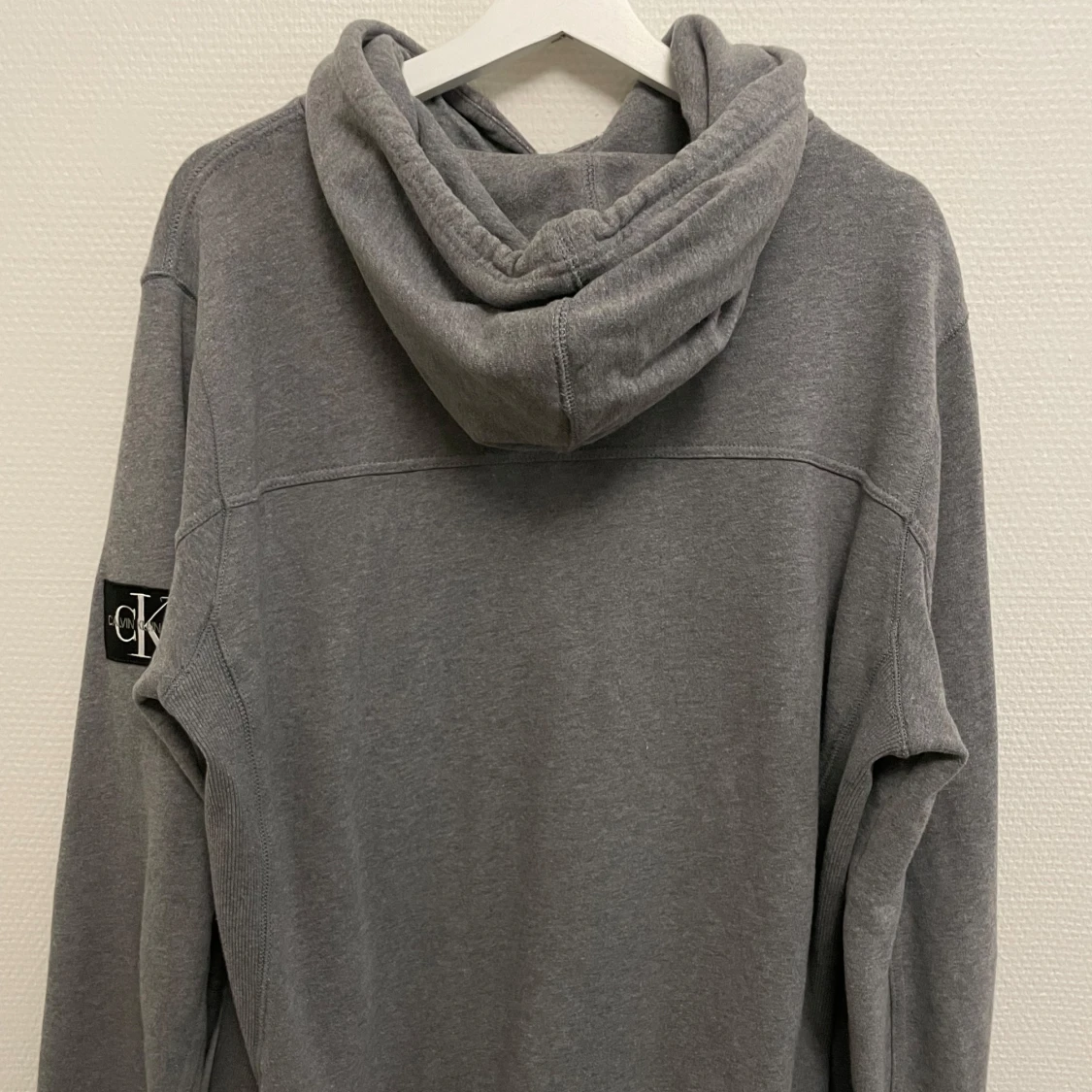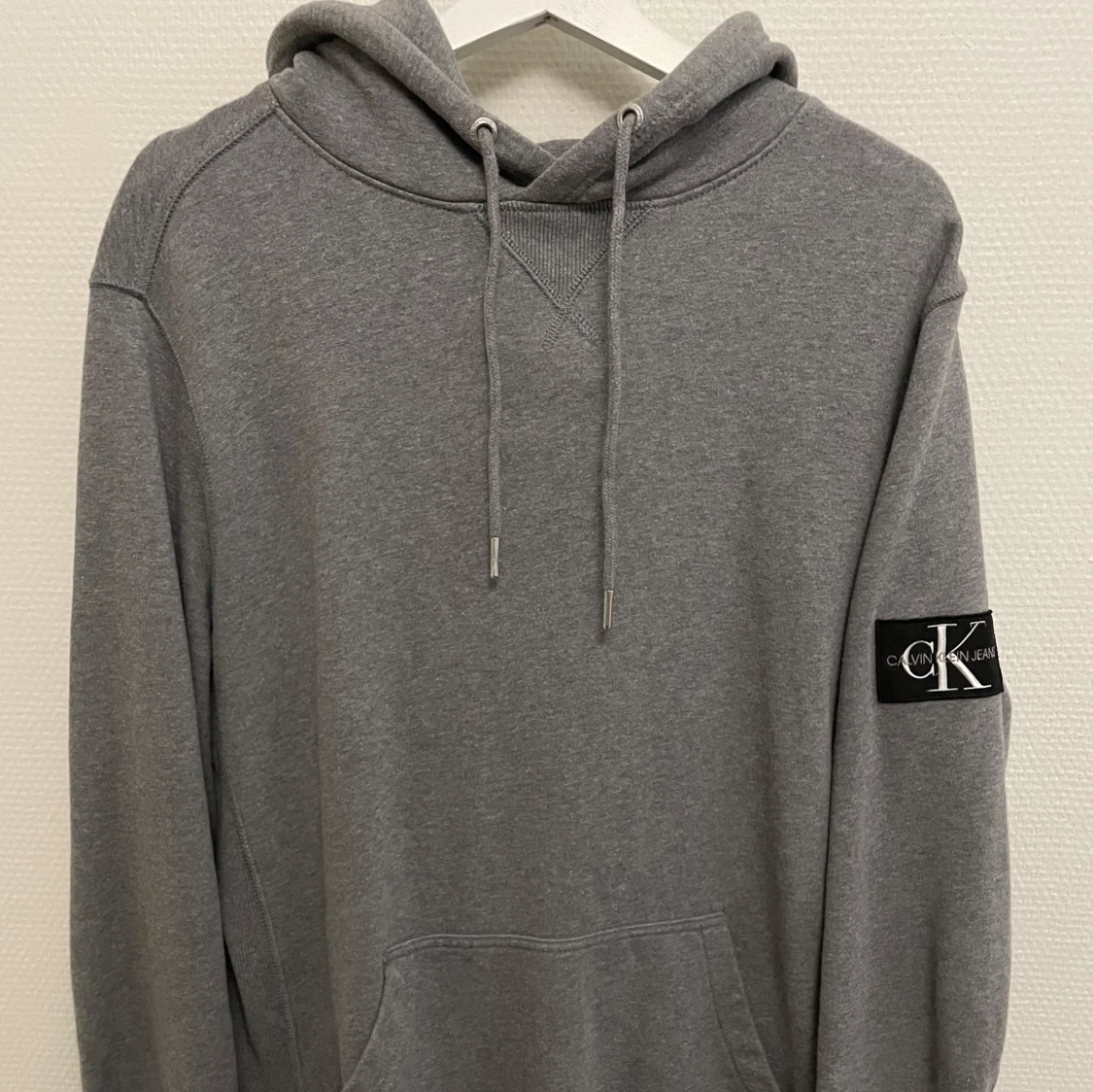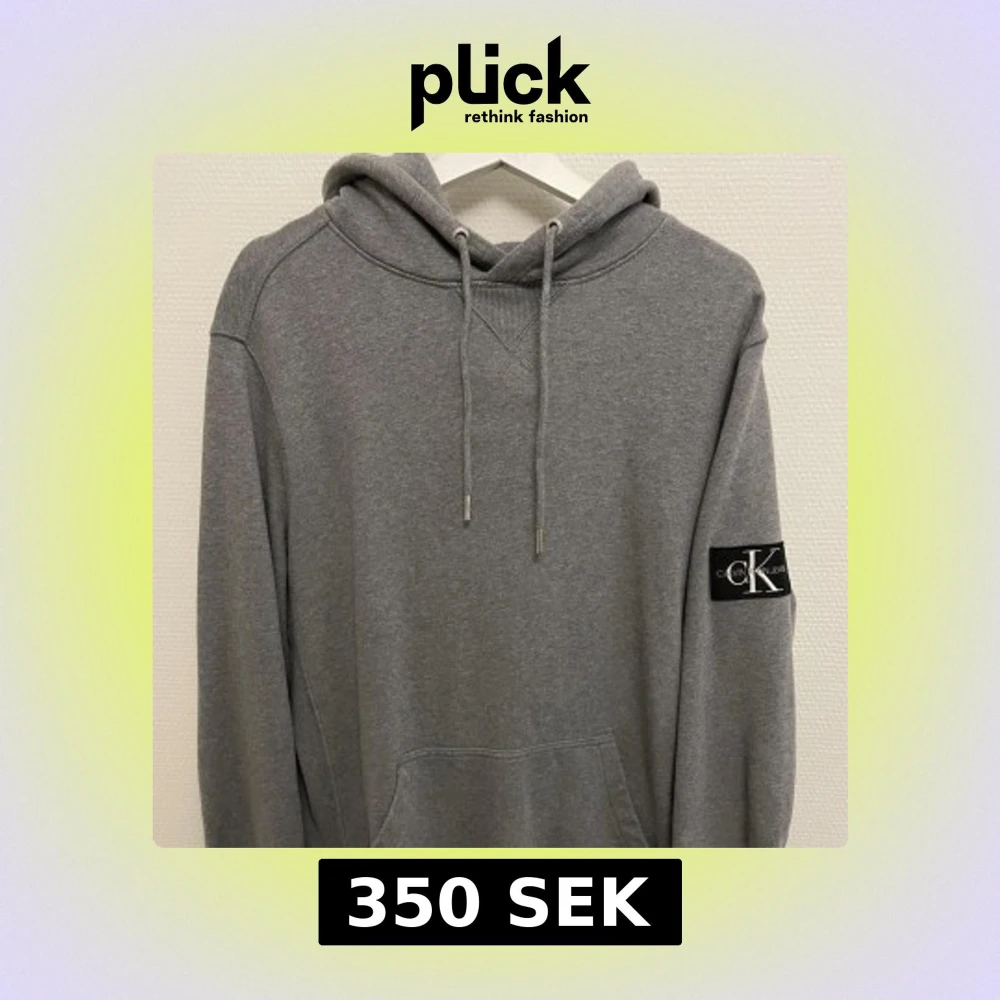 Säljer en stilren grå hoodie från Calvin Klein med en klassisk passform. Tröjan har en justerbar huva med snören och en ficka framtill. På ärmen finns en diskret logga. Perfekt för en avslappnad look.