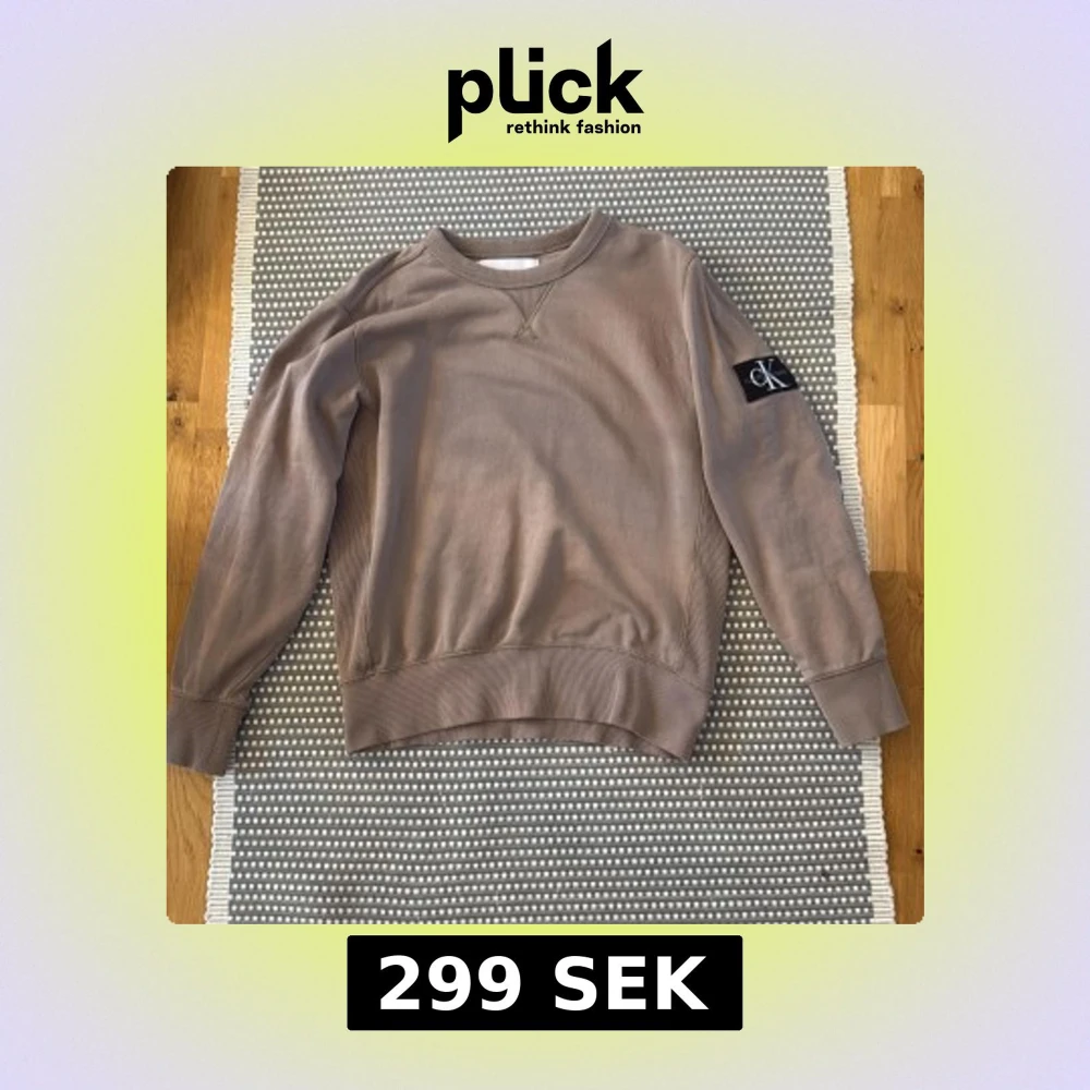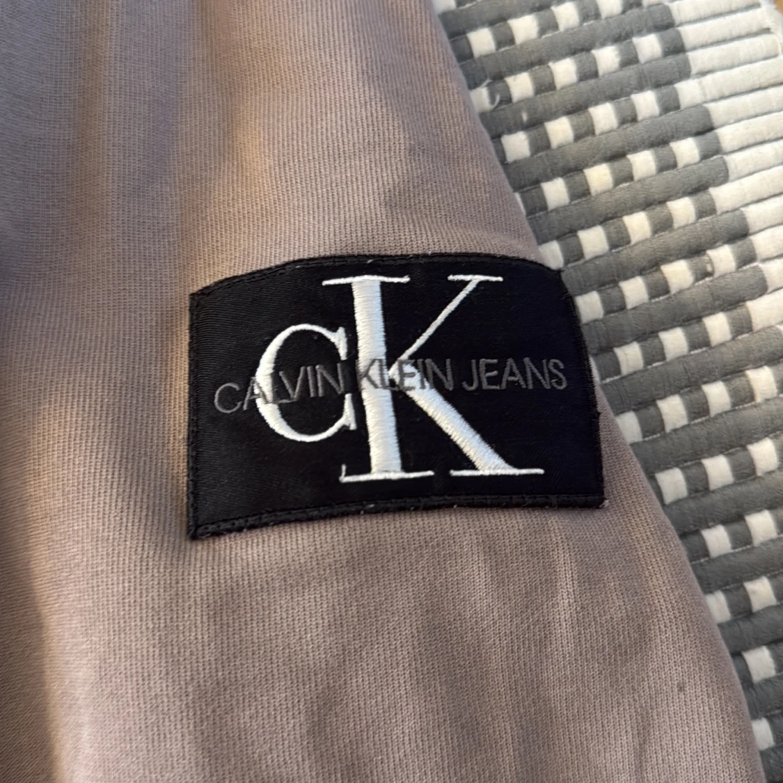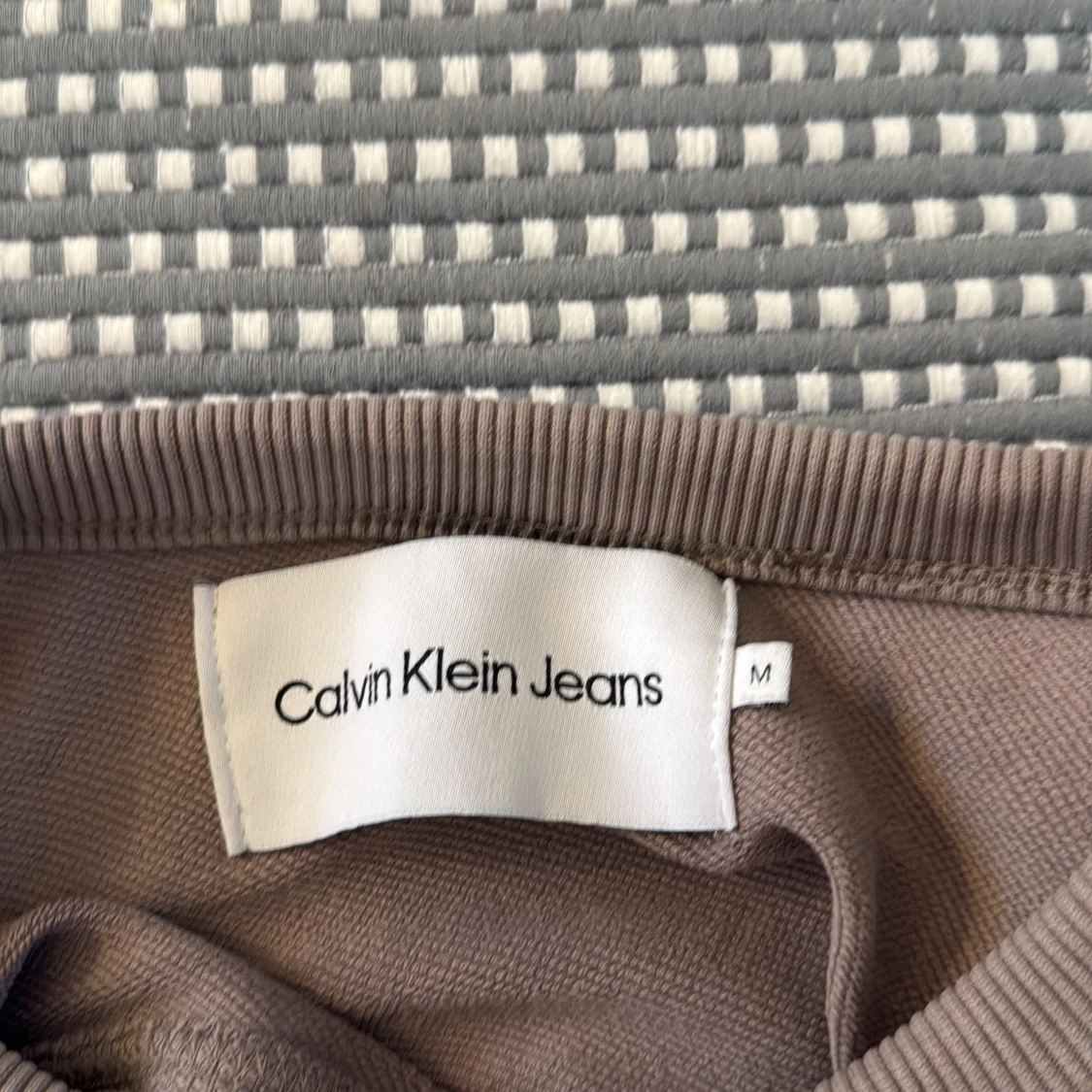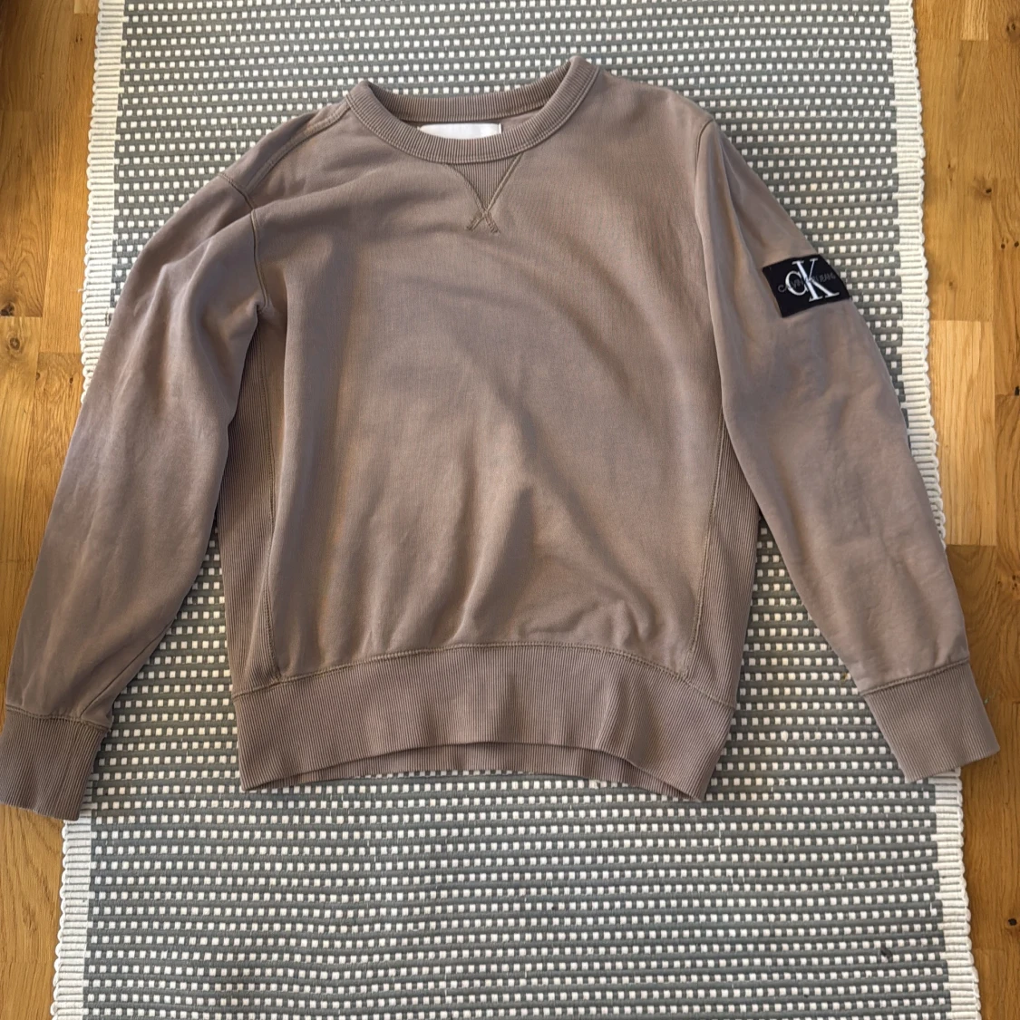 Säljer en beige sweatshirt från Calvin Klein Jeans med klassisk rund hals och ribbade muddar. Tröjan har en svart CK-logga på ena ärmen och är i mjuk bomull. Perfekt för en chill och stilren look.