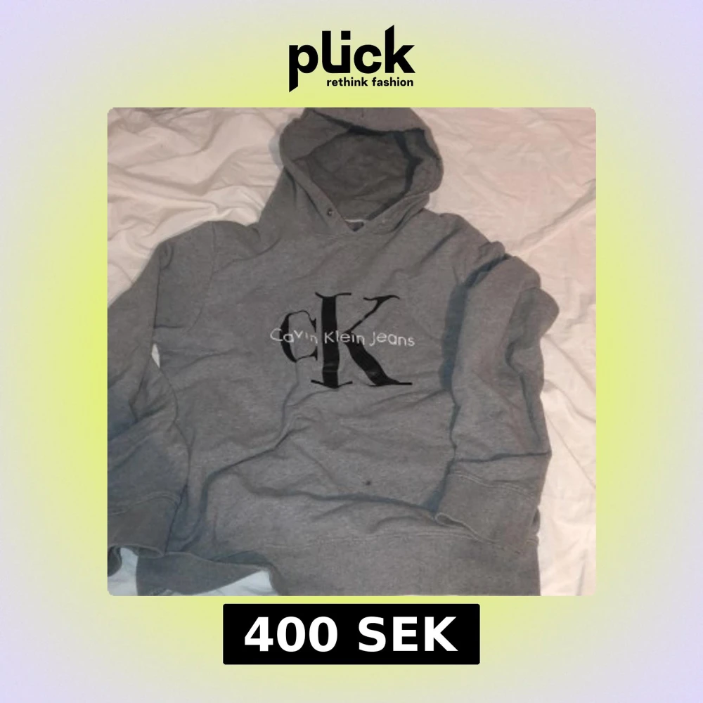 Säljer en grå hoodie från Calvin Klein med stor svart CK-logga och vit text på bröstet. Tröjan har huva och långa ärmar, perfekt för en chill och avslappnad stil.