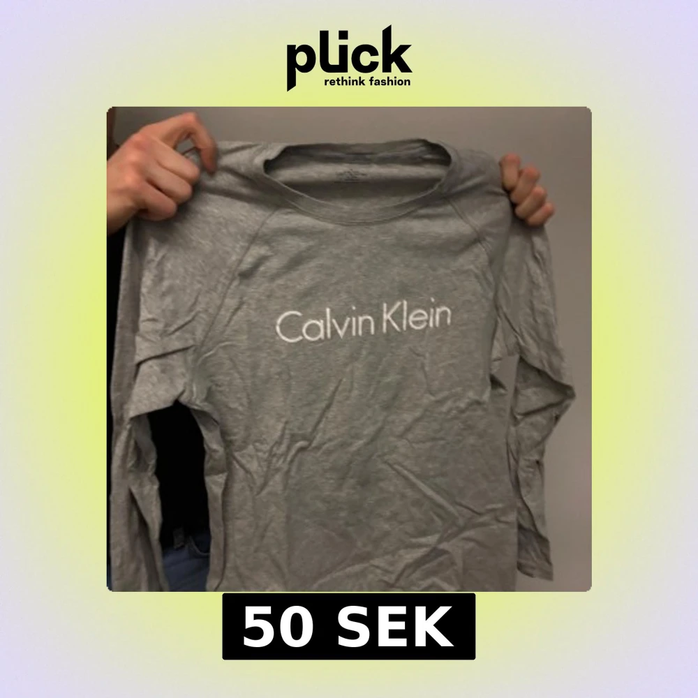 Säljer en stilren grå långärmad tröja från Calvin Klein med deras ikoniska logga tryckt på bröstet. Perfekt för en avslappnad och trendig look.