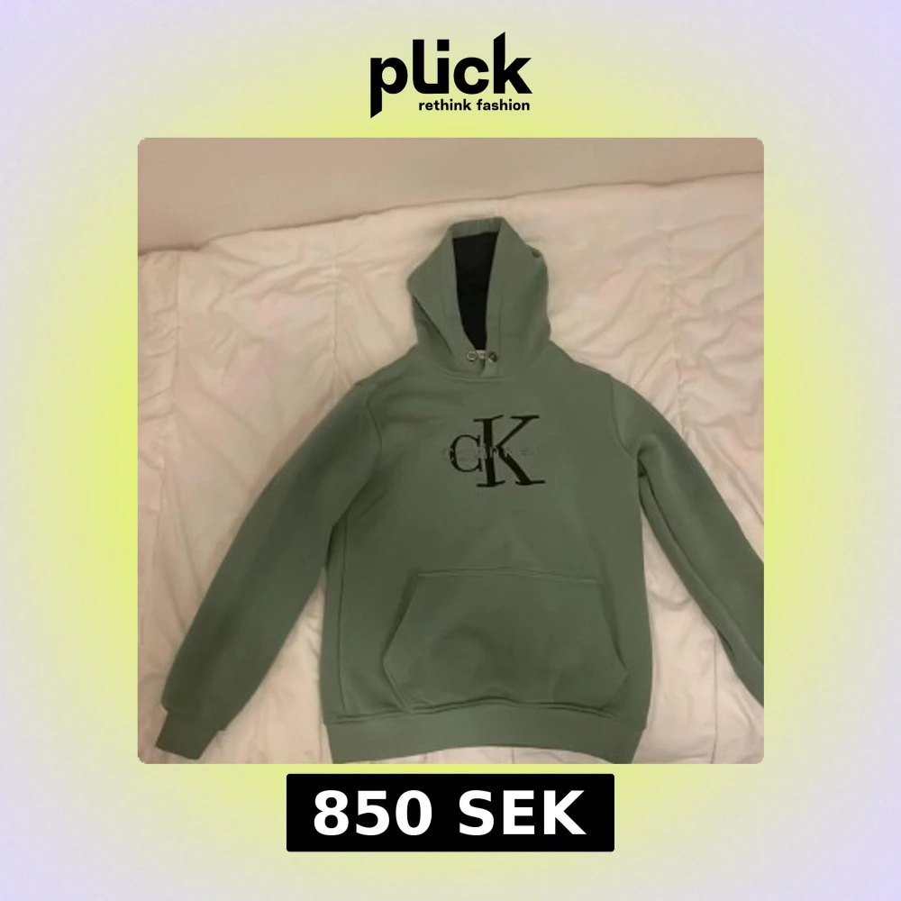 Snygg ljusgrön hoodie från Calvin Klein med stor svart CK-logga på bröstet. Tröjan har huva med snörning, magficka och ribbade muddar vid ärmslut och nederkant. Perfekt för chill dagar och streetwear-stil.