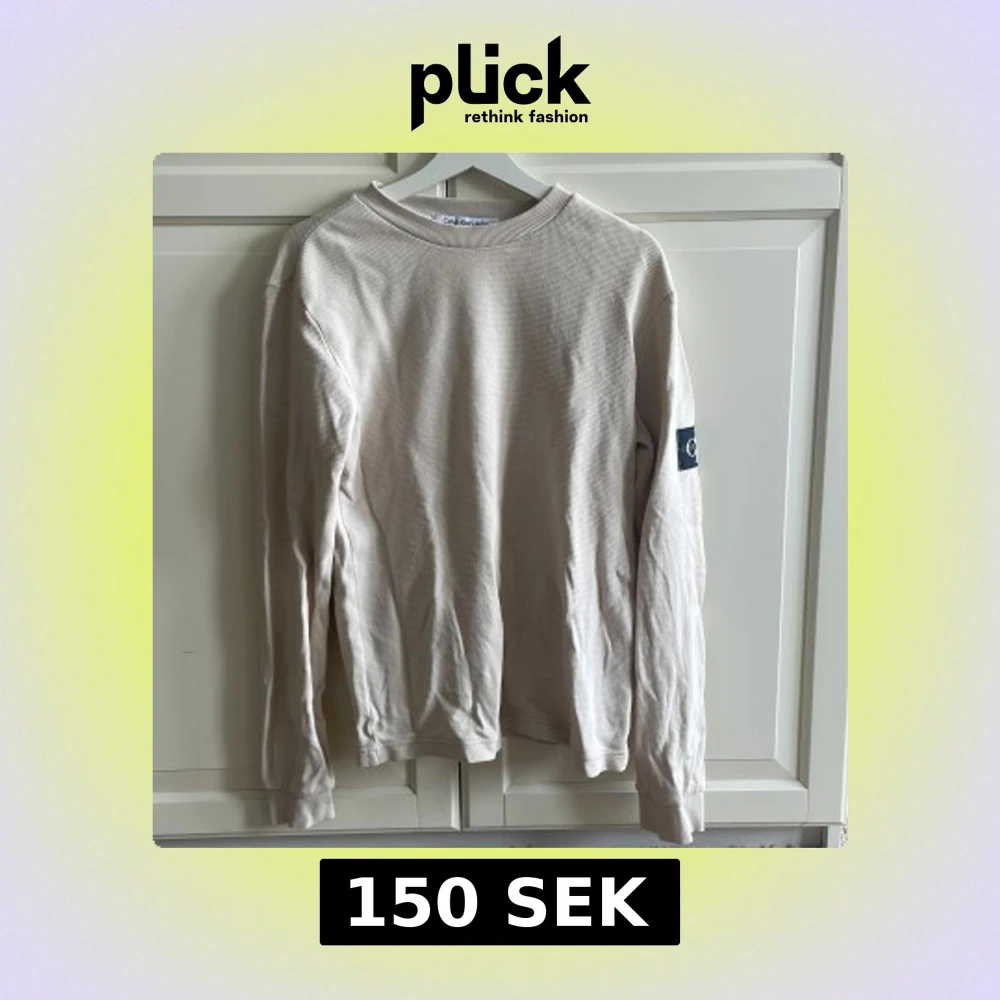 Säljer en beige långärmad tröja från Calvin Klein med diskret struktur och rund hals. Tröjan har en stor svart CK-logga på vänster arm