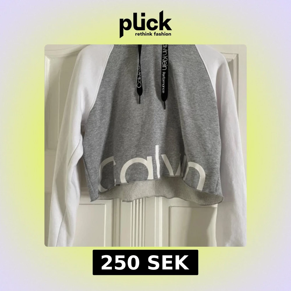 Säljer en snygg grå och vit hoodie från Calvin Klein Performance. Den är croppad med långa ärmar och har en stor logga framtill.