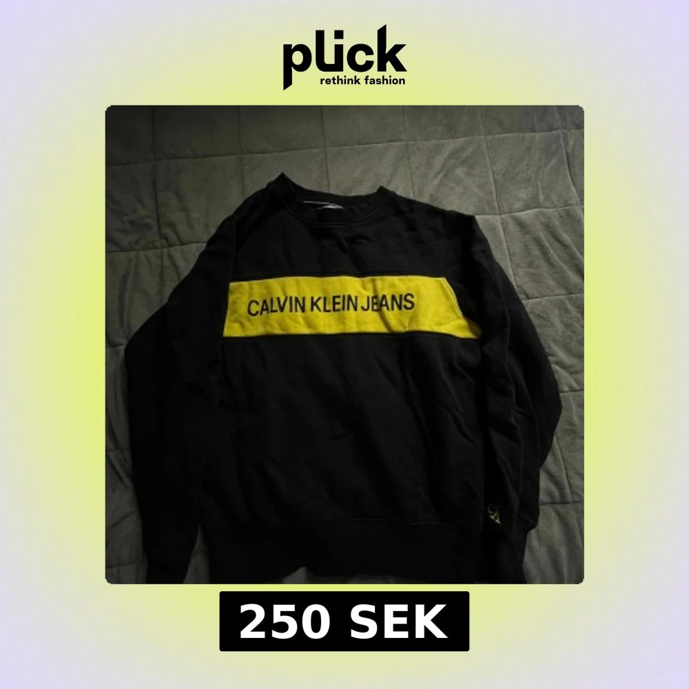 Svart sweatshirt från Calvin Klein Jeans i storlek XS. Tröjan har en bred gul panel över bröstet med loggan tryckt i svart och en liten gul CK-brodyr vid ärmslutet. Klassisk rund hals och långa ärmar. Perfekt för en chill och stilren look.