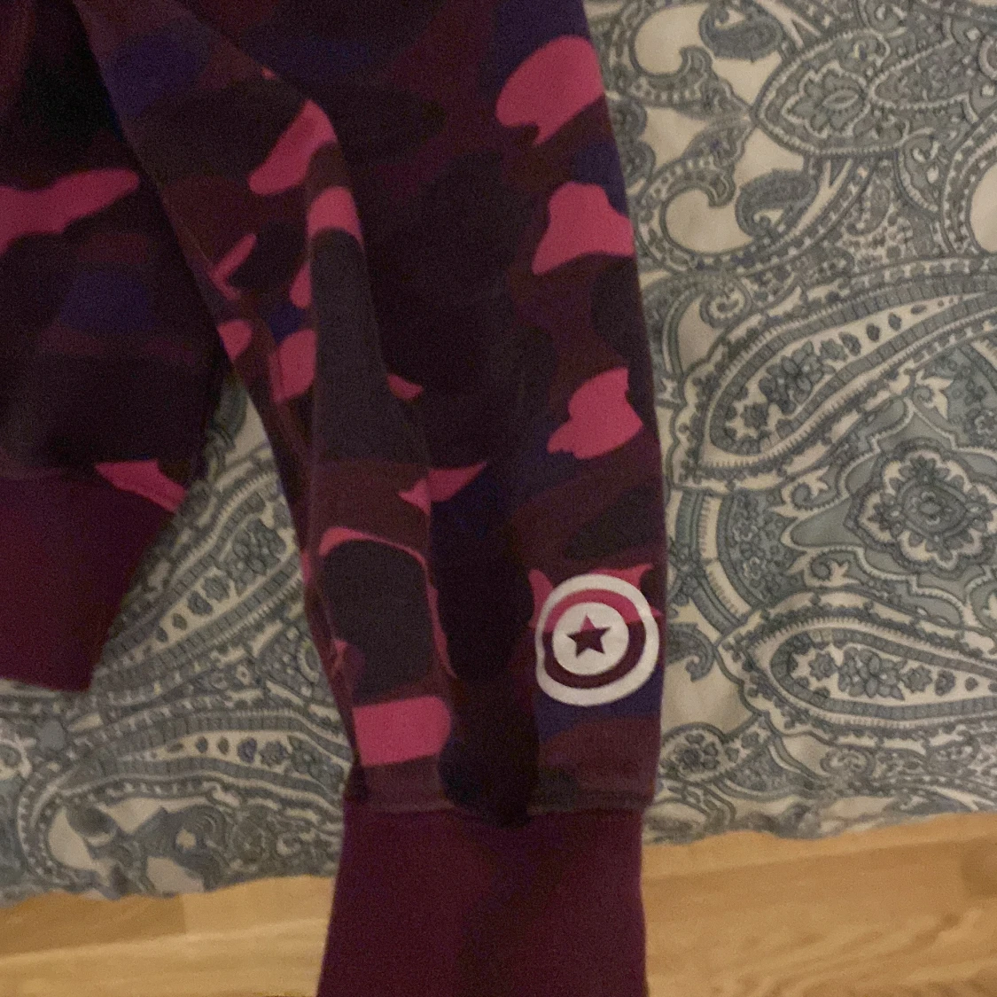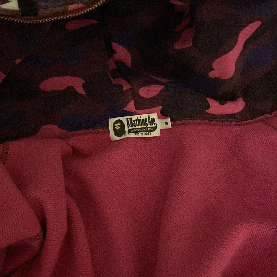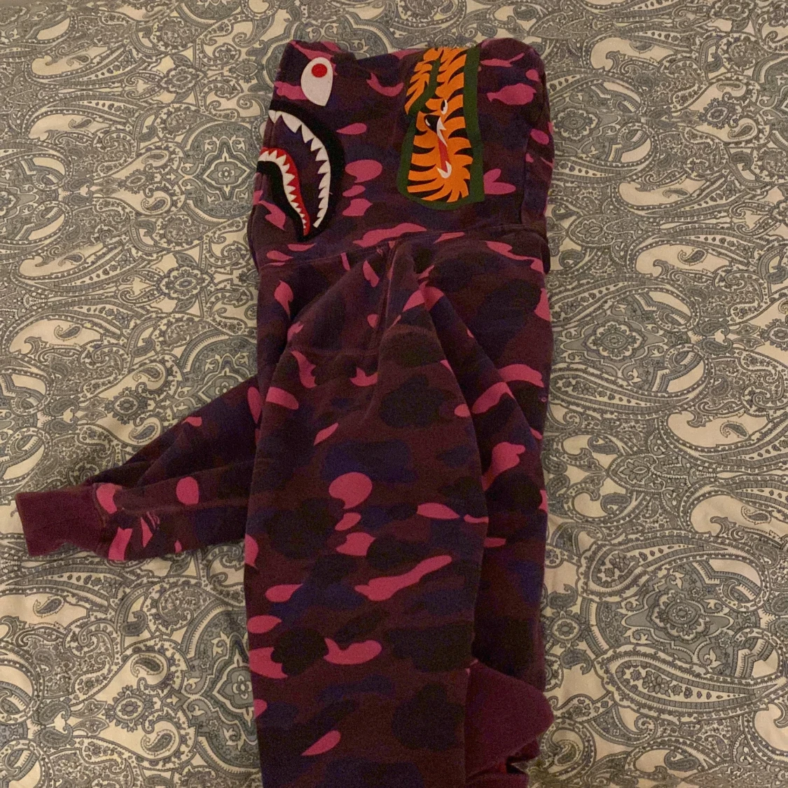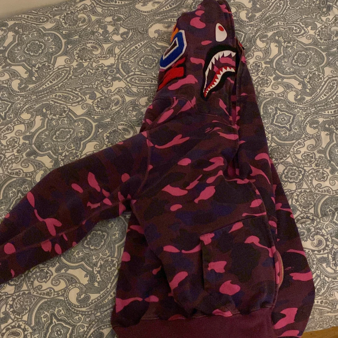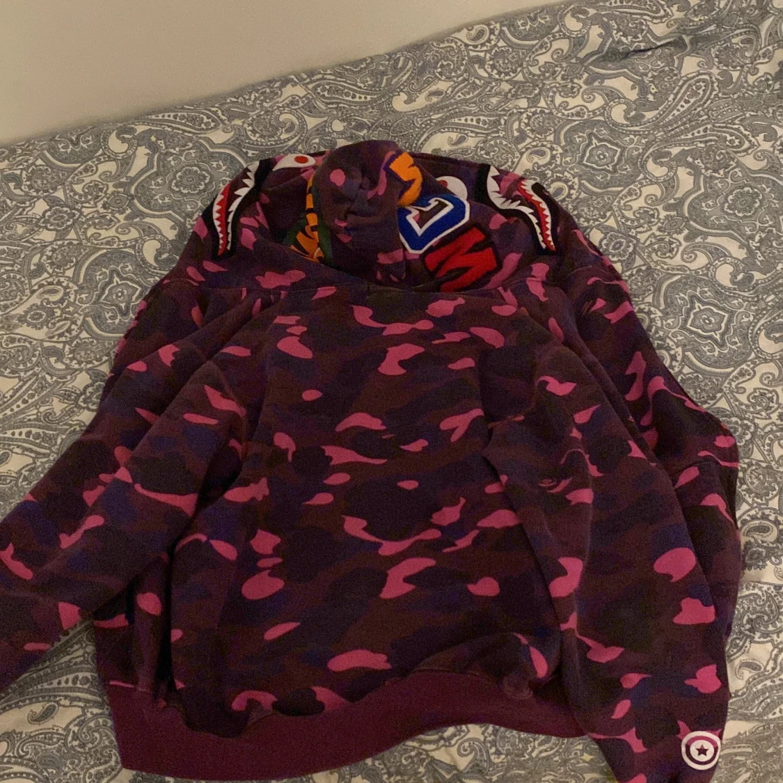 Säljer en cool hoodie från A Bathing Ape med ett unikt rosa och lila camouflage-mönster. Hoodien har en dragkedja och en hajdesign på huvan med broderade detaljer. Perfekt för dig som vill sticka ut! Använd men gott skick