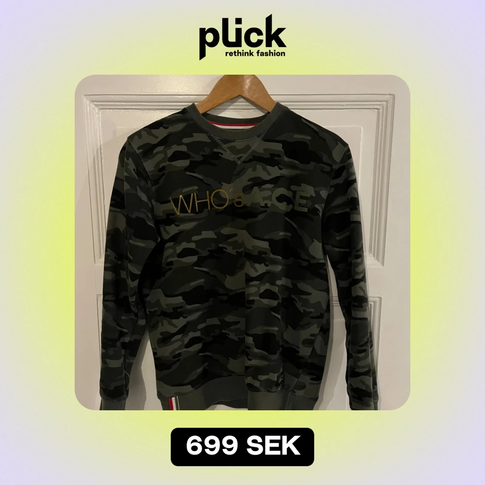 Säljer en cool camouflage tröja från WHO's A.C.E i storlek S. Tröjan är i bra skick och redo för nya äventyr!