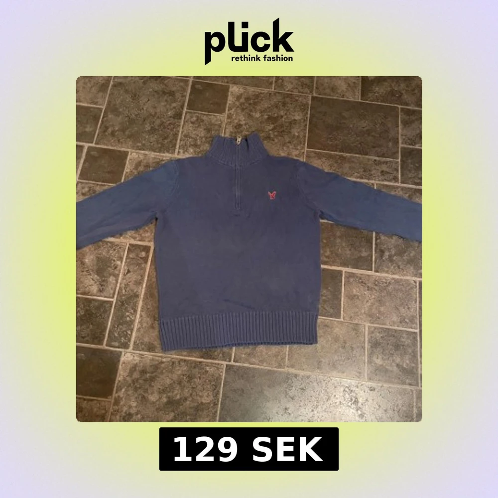 Säljer en blå tröja från American Eagle med dragkedja vid halsen och ett rött broderat emblem på bröstet. Tröjan har långa ärmar och ribbade muddar vid ärmslut och nederkant. Perfekt för kyliga dagar!