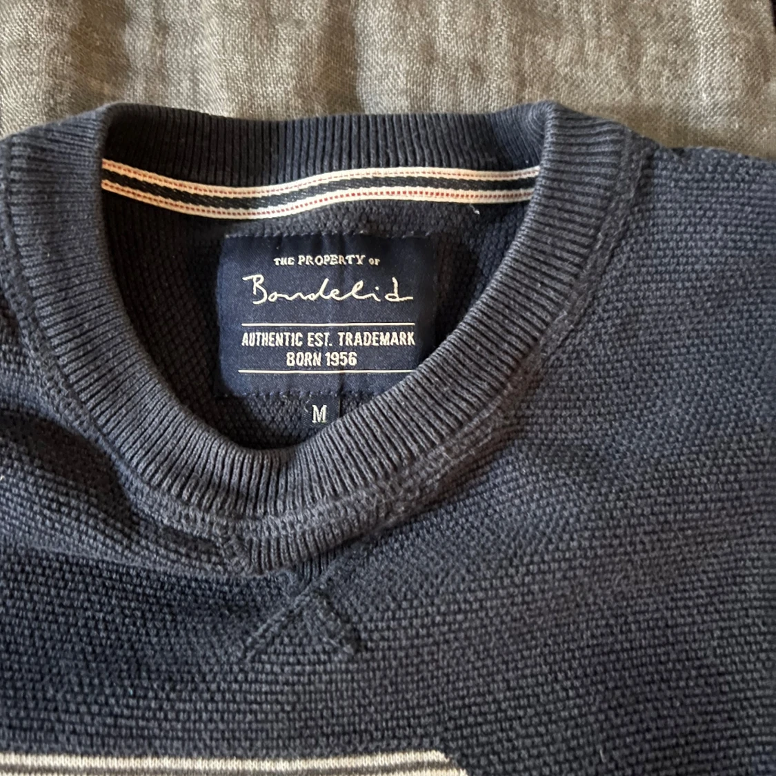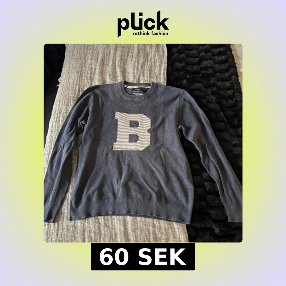 Säljer en mörkblå tröja från Bondelid med en stor vit bokstav 'B' på framsidan. Tröjan har långa ärmar och en rund halsringning. Perfekt för en kallare sommarkväll