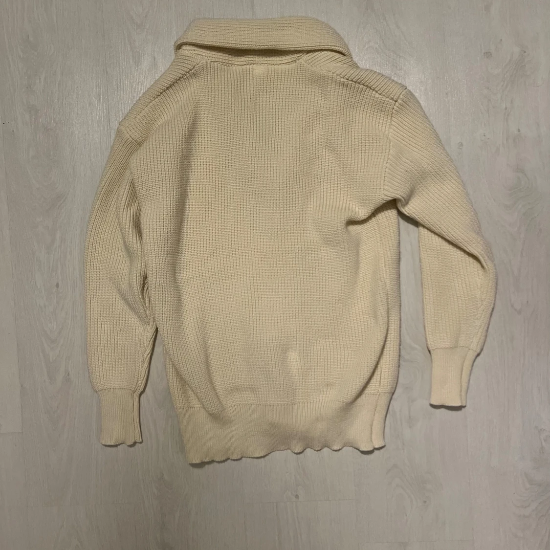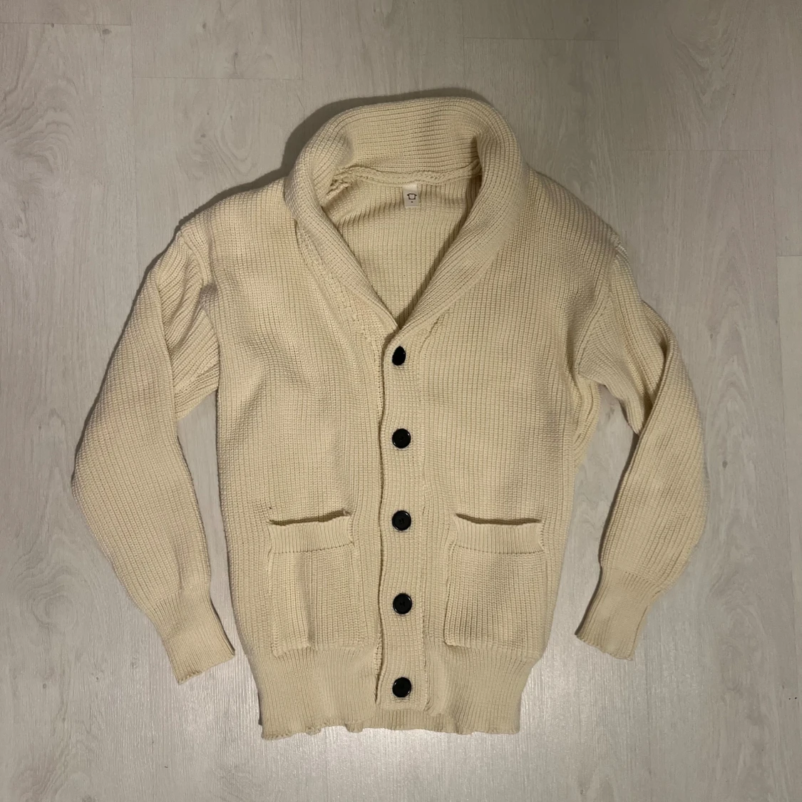 Säljer en beige stickad kofta med grov struktur och stora svarta knappar framtill. Koftan har två rejäla fickor, bred krage och långa ärmar med ribbade muddar. Perfekt för lager-på-lager och chill stil.