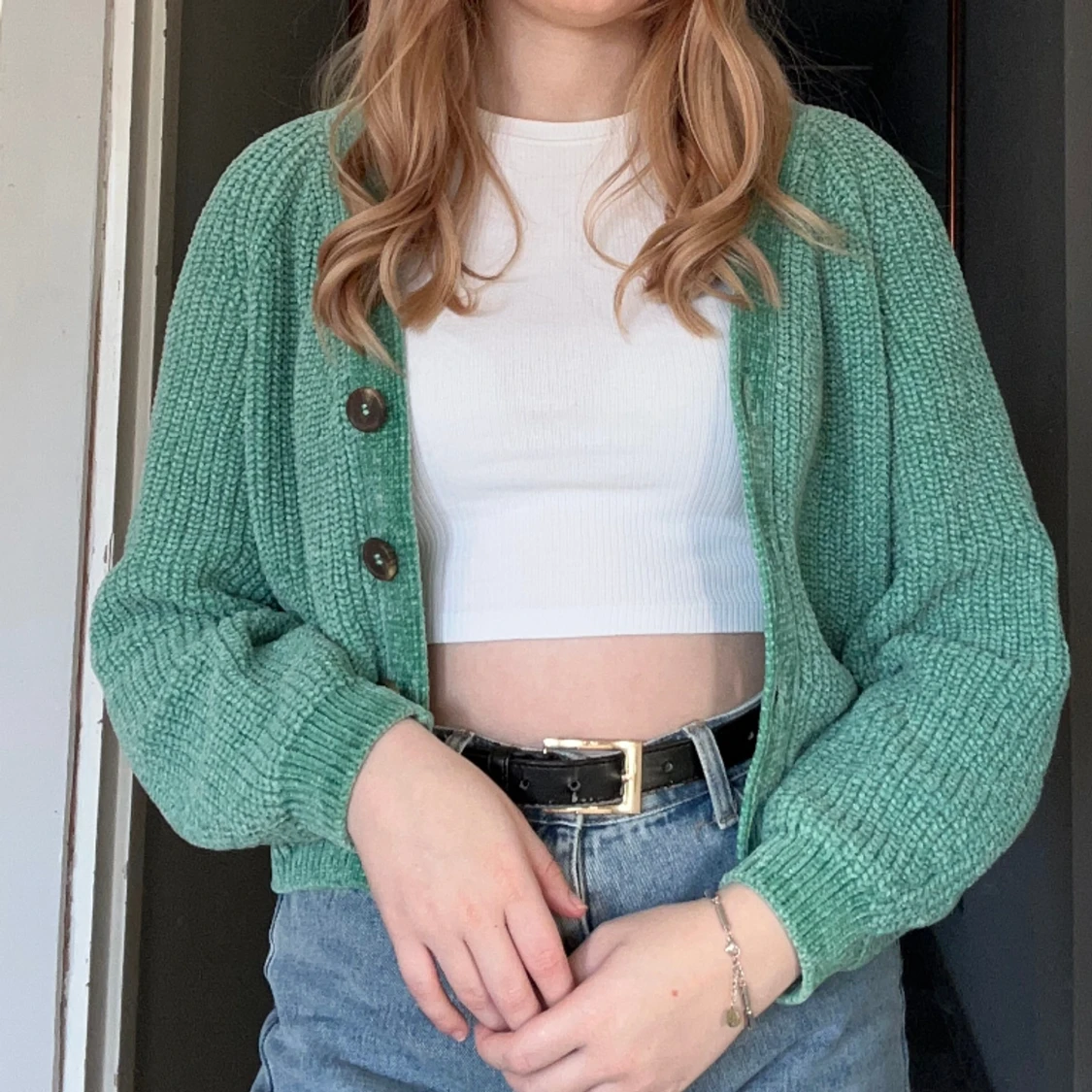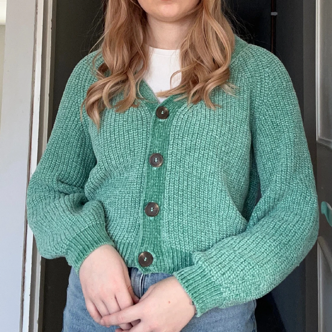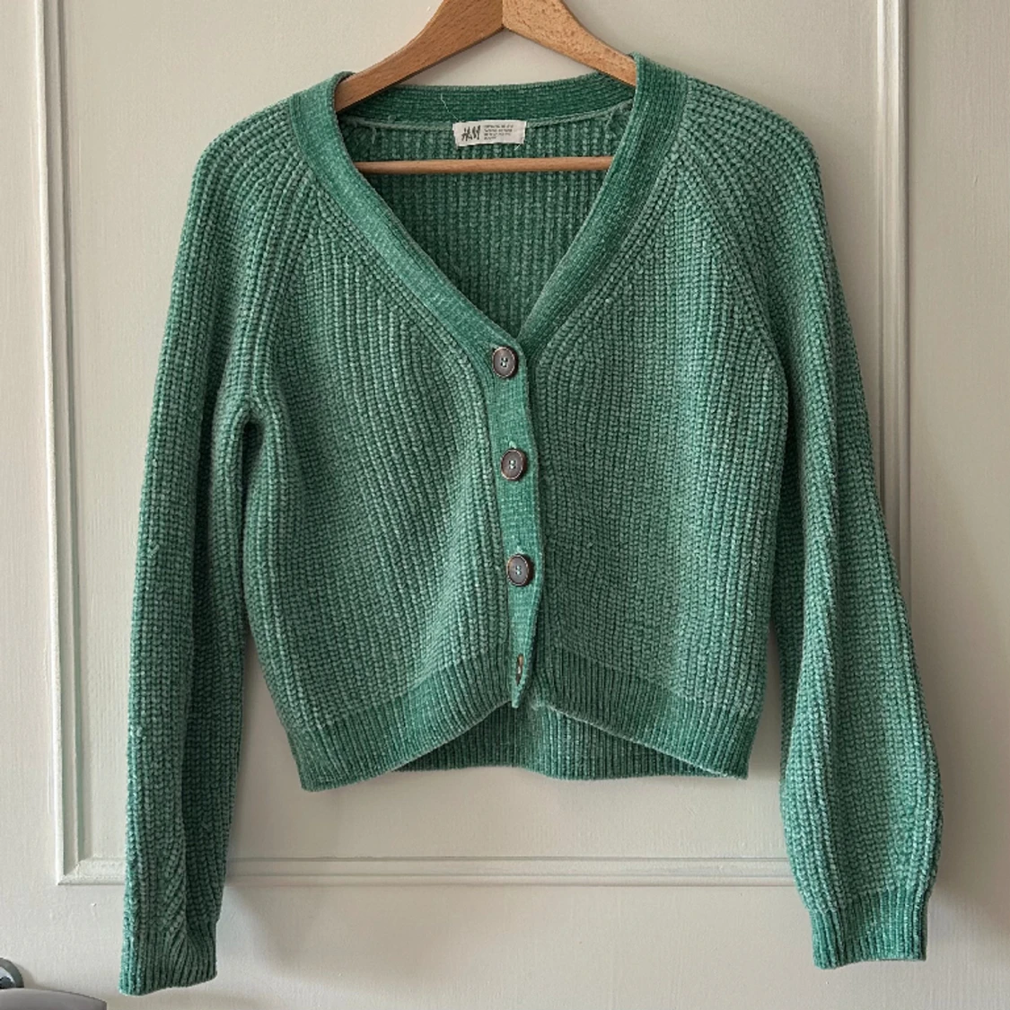 Söt grön cardigan, köpt på barnavdelningen (146/152) men passar XXS/XS. Jag har S och den funkar på mig men känns lite liten.