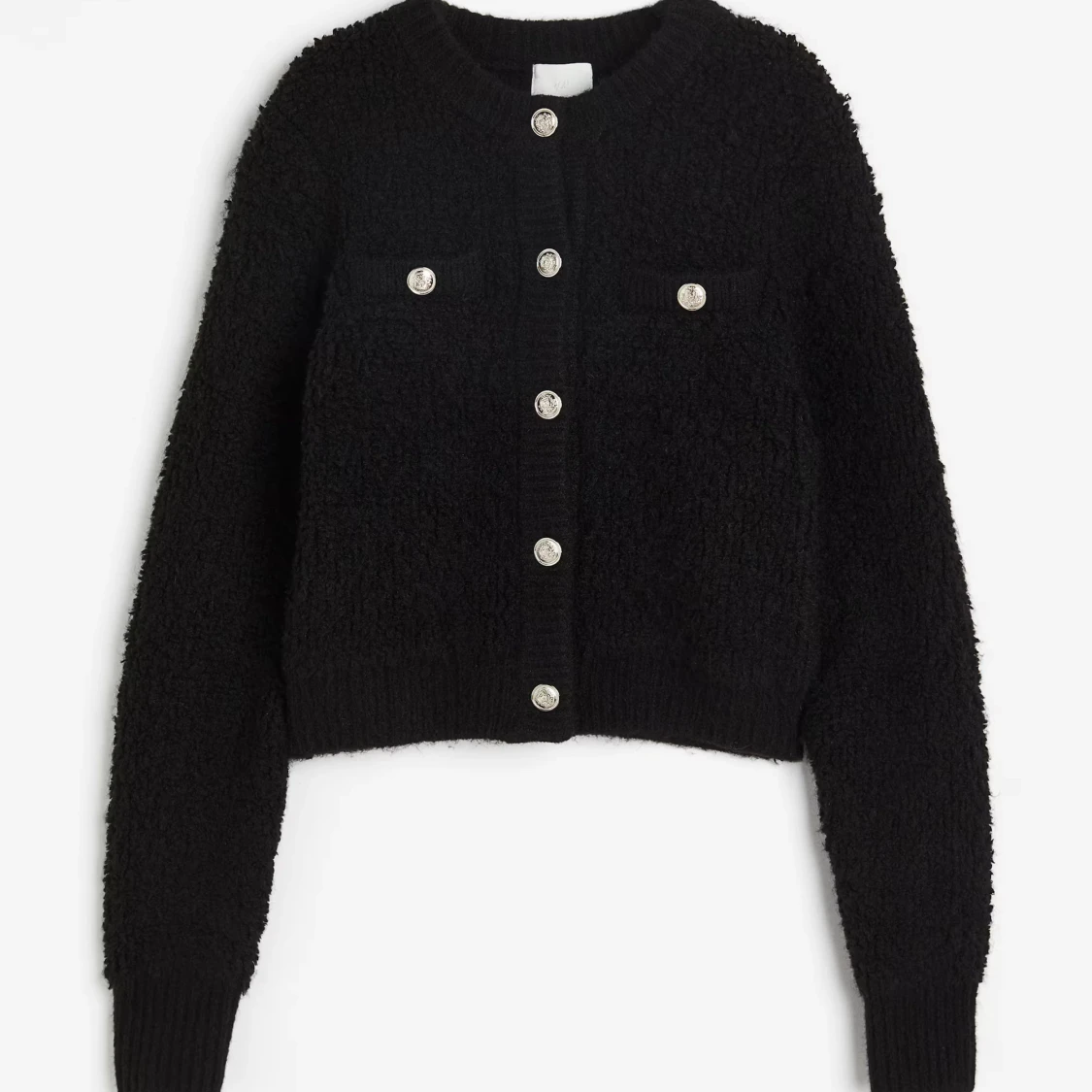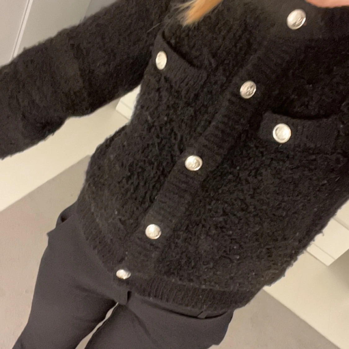 Säljer en supermysig svart kofta med fluffig textur och snygga knappar framtill. Perfekt för kyliga dagar och att ha över en t-shirt eller blus. Koftan har långa ärmar och en klassisk rund halsringning. Passar både till vardags och lite finare tillfällen🥰😚🙌🏼💖 SLUTSÅLD!!