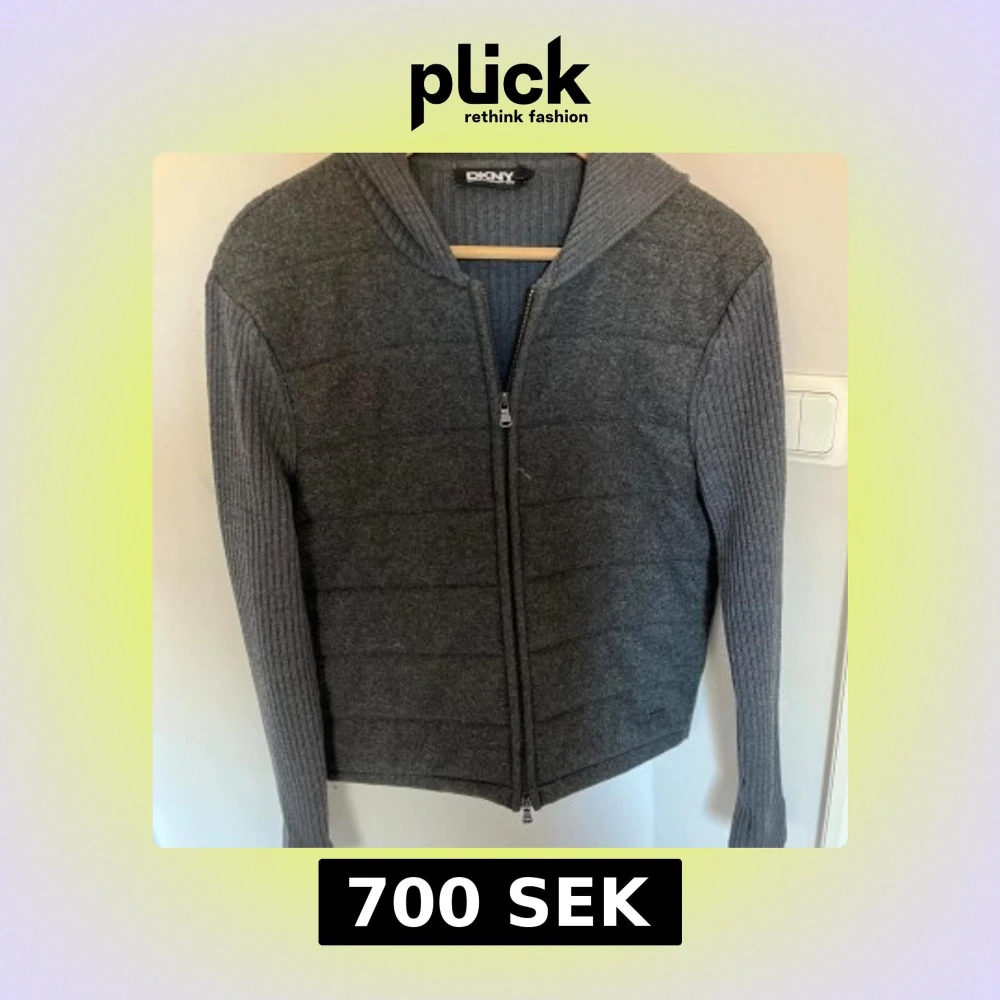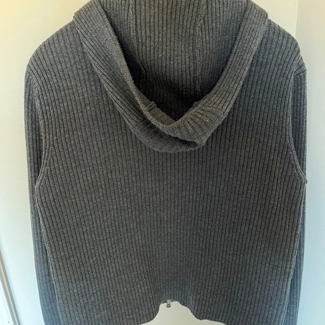 Snygg grå cardigan med dragkedja framtill. Tröjan har en ribbad design på ärmar och huva, vilket ger en stilren look. Perfekt för kyligare dagar. Skicket är super bra inga defekter alls. Den har aldrig använts.